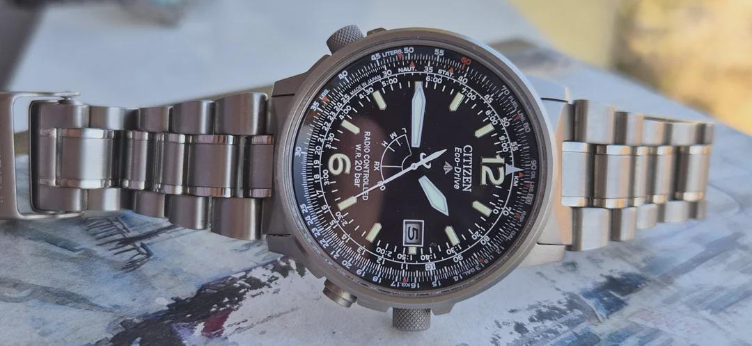 Up for sale is my **PMD56-2771 JDM Promaster Sky Pilot.** Nice and not so offten Citizen made for Japan domestic market. Case and bracelet are made from hard **Duratect Titanium** \- Hypo-allergenic ,Sapphire crystal perpetual calendar **atomic timekeeping** \- Atomic timekeeping is intended for Japan only, but it can be used with emulator app worldwide. Tested with JJY Emulator and works nice. All working as it should. both atch case and bracelet are in good condition, thanks to Duratect coating. Bracelet is long for up to 18.5-19cm wrist size. . Features: Citizen's Eco-Drive movement H416 Precision: ±15 seconds/month (without radio reception) JJY signal radio reception Power Saving feature, up to 2 years at full charge Perpetual Calendar Internal aeronautical slide rule bezel Titanium MRK Sapphire glass (nonreflective coating) Luminous Hands and markers Waterproof: 20 ATM Hypo-allergenic Case diameter: 43mm Thickness: 12.3mm Weight: 114g pictures: [https://imgur.com/a/Vluwxwd](https://imgur.com/a/Vluwxwd) timestamp: [https://i.imgur.com/xUdCrQ4.jpeg](https://i.imgur.com/xUdCrQ4.jpeg) Price: **330$** paypal (FF or G&S +5%), shipment included in price, worldwide (from EU ) The watches I sell are from my personal collection, I am a collector and a fan of watches, I often renew my collection by buying and exchanging watches with other collectors