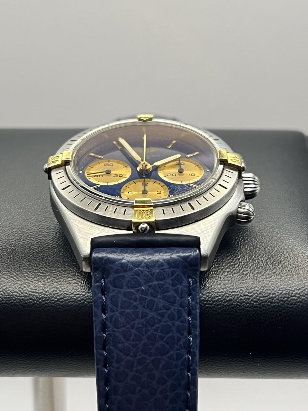 Hello Watch People, For sale is this beautiful Breitling Callisto Chronograph ref. 80520-1, in this fantastic deep blue colour with gold 18k details. It features the same movement used in the Speedmaster pro, the Lemania 1873. The watch is in great overall condition. The movement was serviced last year and runs amazing.Chrono functions work without any issues.Winds smooths. These were made from the mid-1980’s until the early 1990’s. It shares a very similar case design to the chronomat, but with mid-sized dimensions. The case size is 36mm not including the crown and has 18mm lug width. It will fit incredibly if you have a smaller wrist size. See picture on my 6.75” wrist. The watch sits nicely on a brand new leather strap that compliments the watch a lot. It comes with its original buckle. It also comes with the original bracelet that is in not so good condition. Original Box is also included but the inside material has pealed off a lot. Asking a reasonable 1250$ shipped! Located in Europe, but happy to ship internationally !