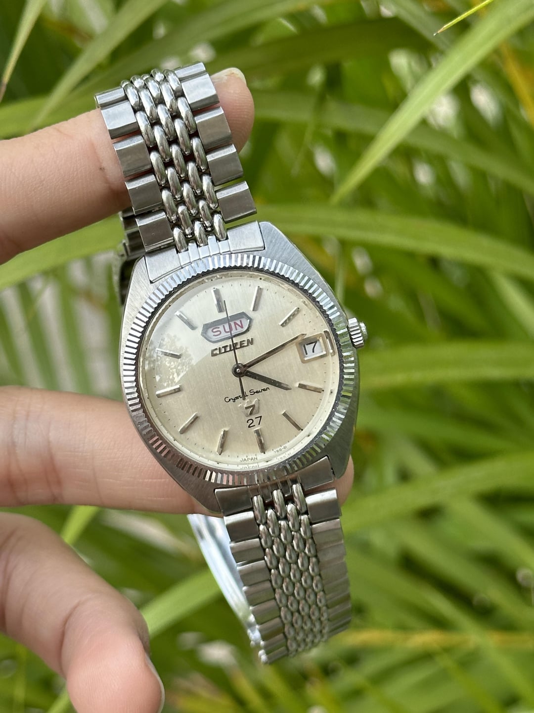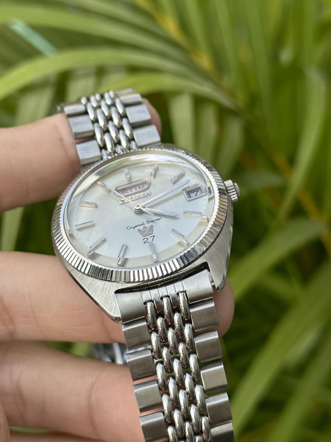 Up for sale is CITIZEN Crystal Seven 27 Jewels fluted bezel Linen dial Specifications: • Movement: Automatic, weekdater English only day • Original bead rice bracelet, fit up to 7.5 inches wrist. • Case: 37mm, no polished, even with blue sticker caseback. • Fluted bezel, original linen dial, • Performance: +10 to +15s per day Timestamp: https://photos.google.com/share/AF1QipPkTo6Ryu1VWX_Zd60ZDh5CzLBpbvvobkWQ1VaF5-uZZUDdL1fhQHxcqzjImEaaIw?key=SnlMVVVzNzEzMjVFbDRXTUM1TXk1U3JzbXltZmln Album: https://photos.google.com/share/AF1QipMpKwYnXHk0R42SekgqQ1HlwJmJg3CLhGFvwvpYuYGugqlytpNfZyFyaWiJpSD-VA?key=d2ZFaXpMRk9CSTdCSUZvVGVkcEZKLW5zVERrVkJ3 I’ve been selling watches in this sub years now, please check my transaction flair. I’m asking for USD 399 Net via PayPal F&F or direct wire including DHL Express Worldwide shipping with tracking number. Thanks! DHL Express -> US conus, North America, Europe, Australia : 3-5 days DHL Express -> UAE Dubai: 1-2 days
