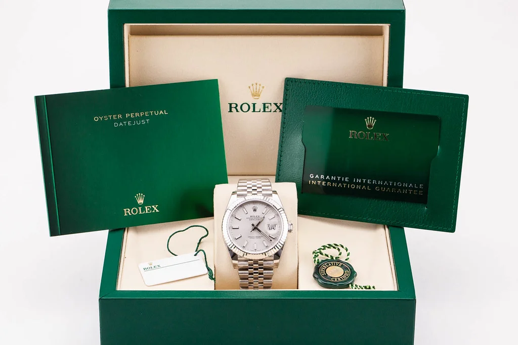Up for sale is a brand new Rolex Datejust 41 Silver Stick Dial with Fluted Bezel on Jubilee Bracelet, reference # 126334. It comes complete with all newly redesigned boxes, papers, booklets, hang tags and Rolex Warranty Card dated April 2025.