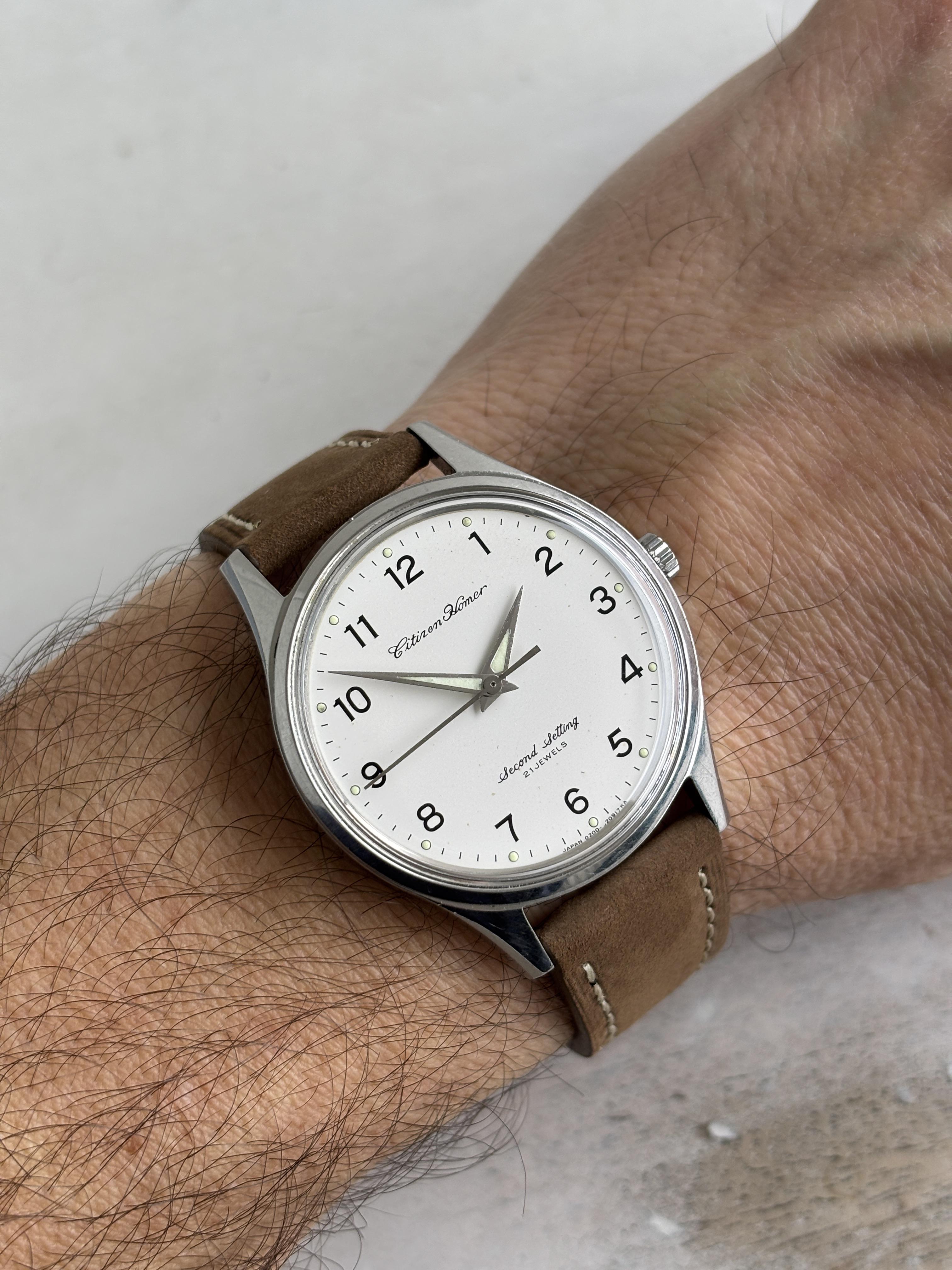 Citizen Homer Railroad. The official wristwatch of the Japanese Railways in the 60s and 70s. The movement used is 21 jewel caliber 911, it is a high-end movement with the same backbone movement used in the Citizen Chrono Master series watches (Citizen's answer to Seiko's Grand and King Seiko). Winding movement serviced in June 2024. Everything works as it should. New leather belt. Case size: 36mm Thickness: 10mm Lug to lug: 44mm Lug width: 18mm Asking 335 USD shipped. Payment via Wise or PayPal F&F. No trades, please. Album: https://imgur.com/a/YiTRsPv Timestamp: https://imgur.com/a/c9rr1RP Thanks for looking and have a nice day.