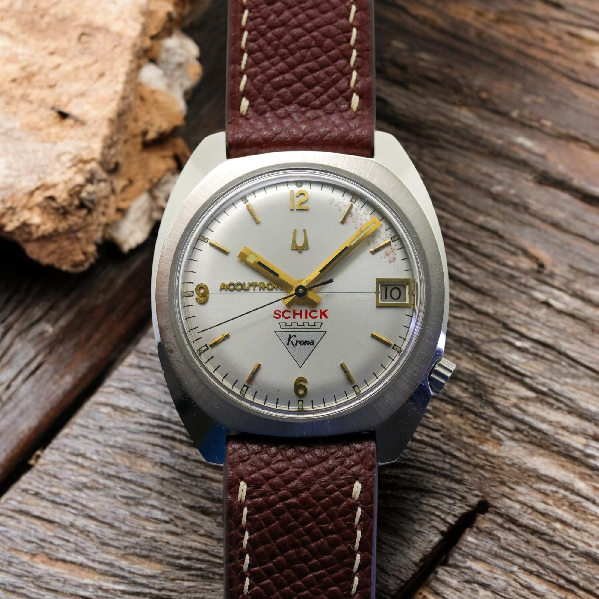A special Accutron by Bulova with a 'Schick' Krona signed dial from 1971. Brand: Accutron Reference: 3133 Movement: 2181 Case: Stainless steel Size: 35mm Lug to lug: 40mm Year: 1971 Strap: Leather Box/papers: No Location: Los Angeles Price: $699 or make me an offer :) CA residents may be subject to tax Pictures: [https://imgur.com/a/u7KWrfA](https://imgur.com/a/u7KWrfA) Timestamp: [https://imgur.com/a/pXFTaDt](https://imgur.com/a/pXFTaDt) CONDITION & SERVICING \-The silver dial is in very good condition with slight oxidization around 1 and 2 o'clock indices. \-The unpolished case is in very good condition not showing any notable damage. \-Hands and markers are in very good condition. \-The caseback is engraved. \-Service history is unknown.