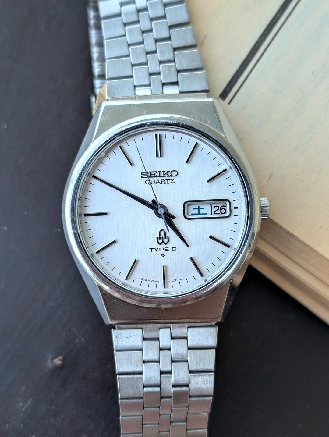 Greetings watchexchange! Up for sale is a beautiful Seiko type II Quartz 7546-8070. The watch is in beautiful condition as pictured, with a clean white vertically brushed dial. The watch comes on its original Seiko bracelet, which will fit wrists up to 6.7". The watch has a bilingual English/Kanji day/date wheel. The watch has a 36mm case and 18mm lugs, and is pictured on a 6.5" wrist for size reference. [Timestamp ](https://drive.google.com/file/d/1sr17AM4mn4Ez1SH8ukUZ_irxheOST7A1/view?usp=drivesdk) The watch is priced to sell at $129 shipped via UPS and paid via Zelle or Wise. Please allow 3 to 5 business days of your payment for the watch to be shipped out. Be sure to reach out to me if you have any questions or require additional photographs or information, I entertain requests for custom timestamps. Thanks for looking!