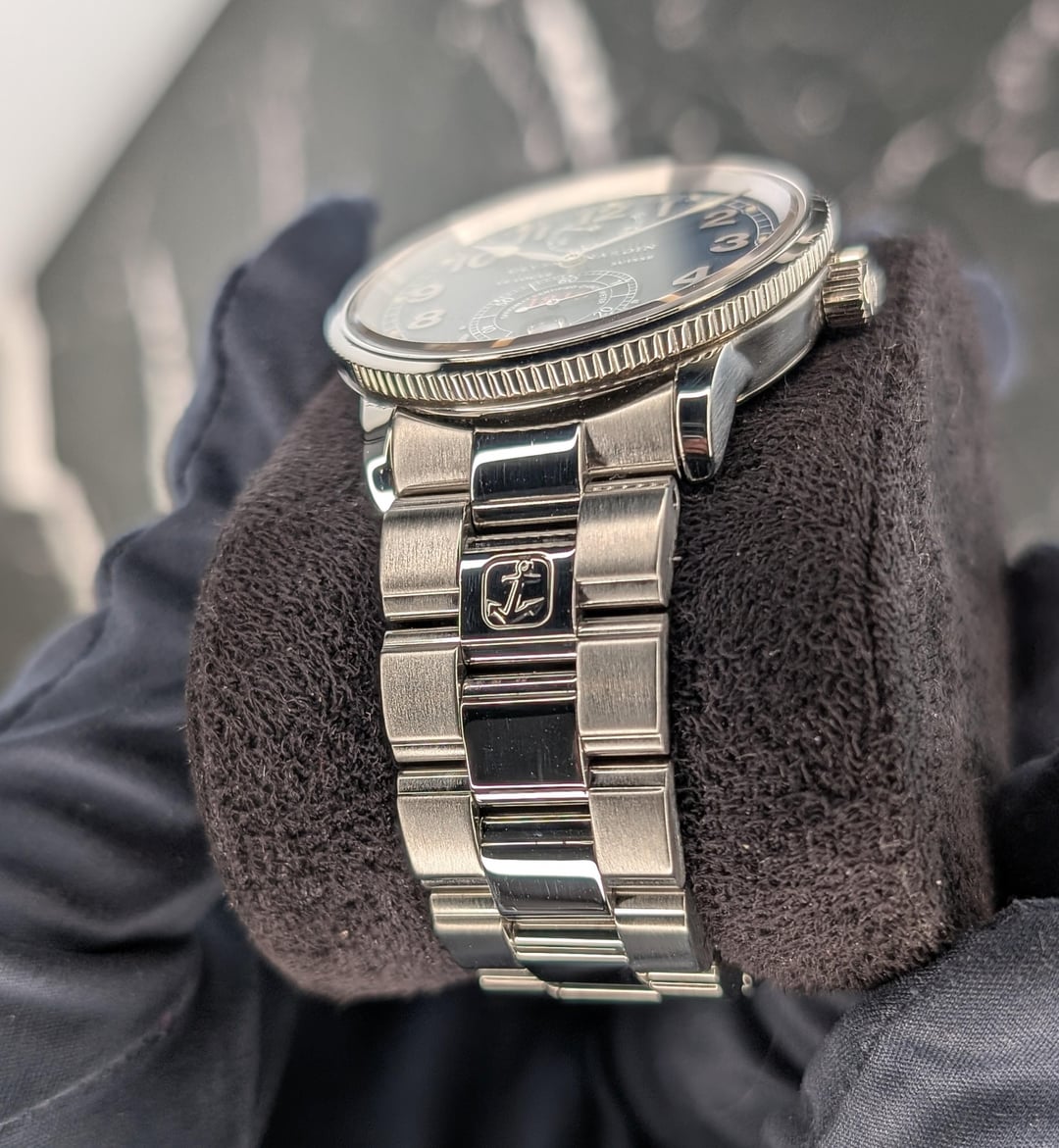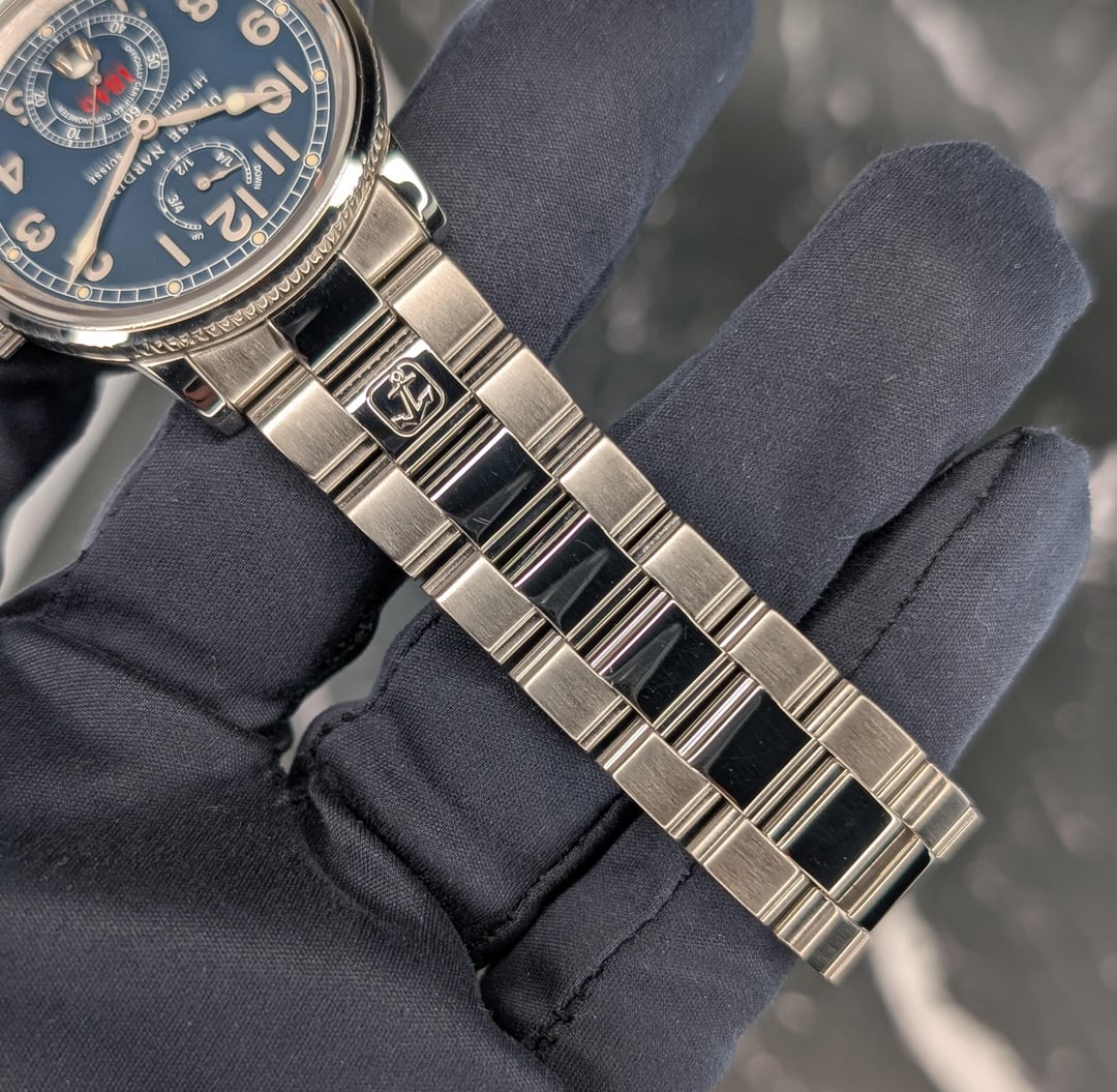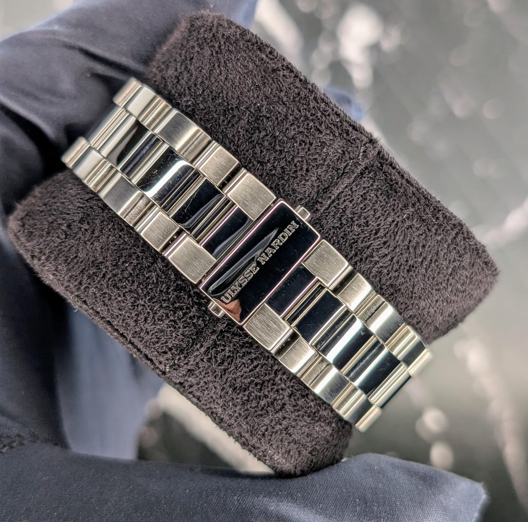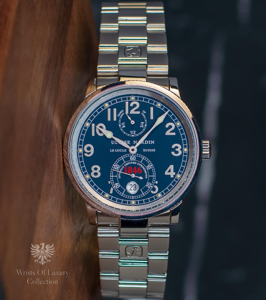 Available today from the Wrists Of Luxury Collection is a timepiece from one of the oldest and highly innovative watch making brands in the world, Ulysse Nardin. This particular model is from their Marine lineup, which was served from their history of making the finest chronometers for nautical navigation purposes before modern technology took over. Ulysse Nardin still carries that rich maritime heritage throughout most of their timepieces today. COSC rated movement, double push button butterfly clasp, screw down crown, power reserve indicator, date, small seconds, coin edge bezel, this piece packs a lot of value into this package. Additionally, none others in this exact configuration available for sale on major platforms. Reference: 263-22 Model: Marine Chronometer Year: 2002 Case Size: 38mm Case Thickness: 11mm Movement: UN-26 automatic Lug Width: 20mm Water Resistance: 200m Power Reserve: 42hrs Max Wrist Size: ~7.75" Scope of delivery: double boxed, watch, COSC certificate w/holder, warranty card, booklets, service receipt, removed links Available for $3250 including overnight fully insured delivery to your local FedEx location. Watch located in Cape Coral, FL This piece was fully overhauled in 2021 by UN, and received a new crown, gaskets, and all four hands replaced. It's currently running phenomenal, see timegrapher photo. Watch just received a touch up polish, may still be a hairline or two on the high polished areas. Only notable remarks are the AR coating on crystal shows wear, and small flea bite at 11 o'clock. Wrists Of Luxury is independent from any watch brand, only providing pieces from it's collection and is in no way endorsed by any manufacturer. All pieces listed are ours, and are as described or better. We have many references across many platforms, with tons of successful transactions. Please don't hesitate to reach out with any questions or concerns! Happy to help. IG WristsOfLuxury
