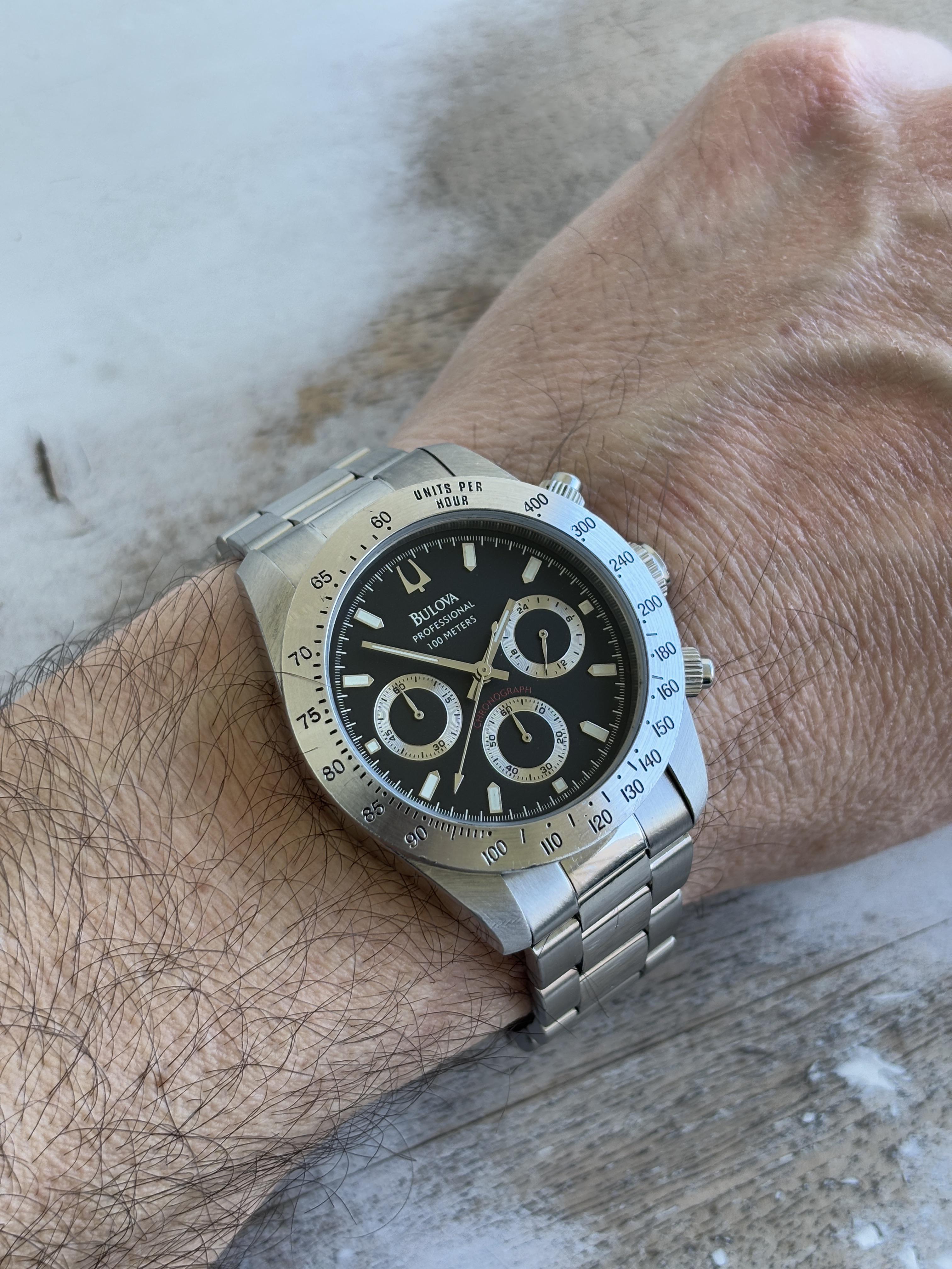 Bulova 93171. Produced in 1990’s. A very cool vintage homage to an iconic watch. Quartz movement. Everything works as it should. Screw down crown. New crystal. New battery installed. Case size: 39mm Thickness: 11mm Lug to lug: 47mm Lug width: 20mm Asking 350 USD shipped. No trades, please. Payment via Wise or PayPal F&F. Album: https://imgur.com/a/fu4FdxL Timestamp: https://imgur.com/a/KCwyXlu Thanks for looking and have a nice day.