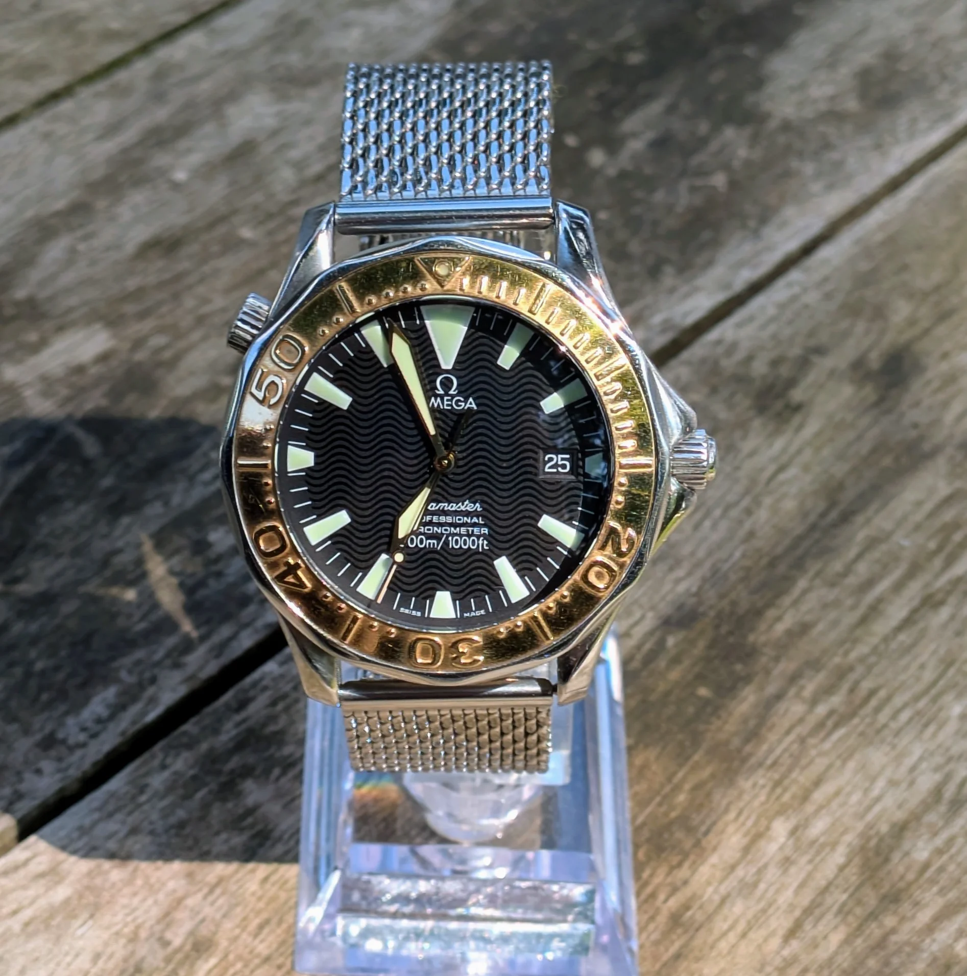 I let go from the collection a Steel/Gold Seamaster diver. It is the large (41mm) Automatic Version which is not that often on the market. It comes with it's S/G bracelet and original Box (No papers).