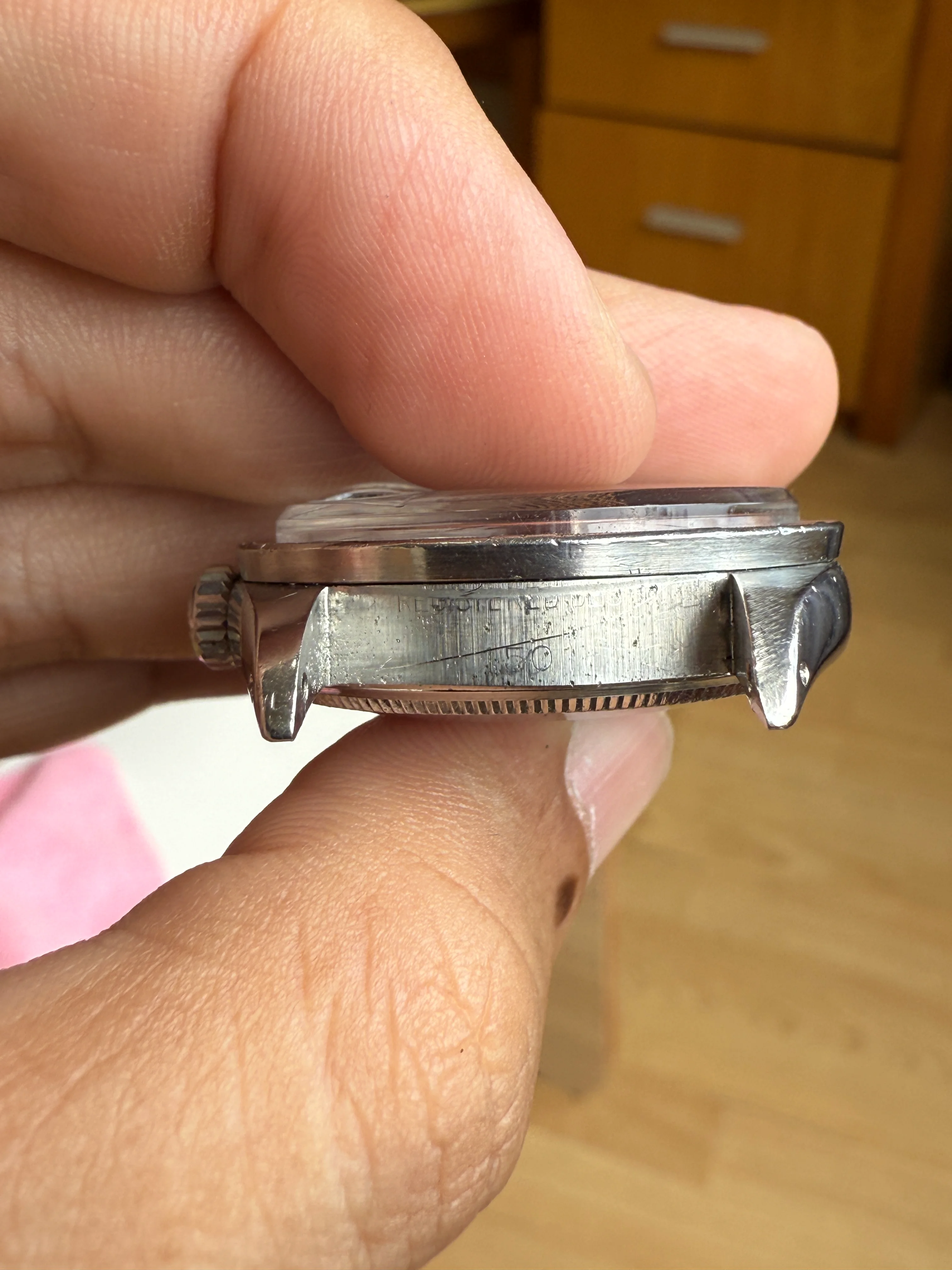 - Case: The diameter is 34mm without the crown (but it feels like 35mm on wrist). Engine turned bezel; original case with in good condition with hairline scratches; there are small dents at 2 (see photos for more detail). Original Rolex crown. Serial number is 2447073, dated to 1970-1971.