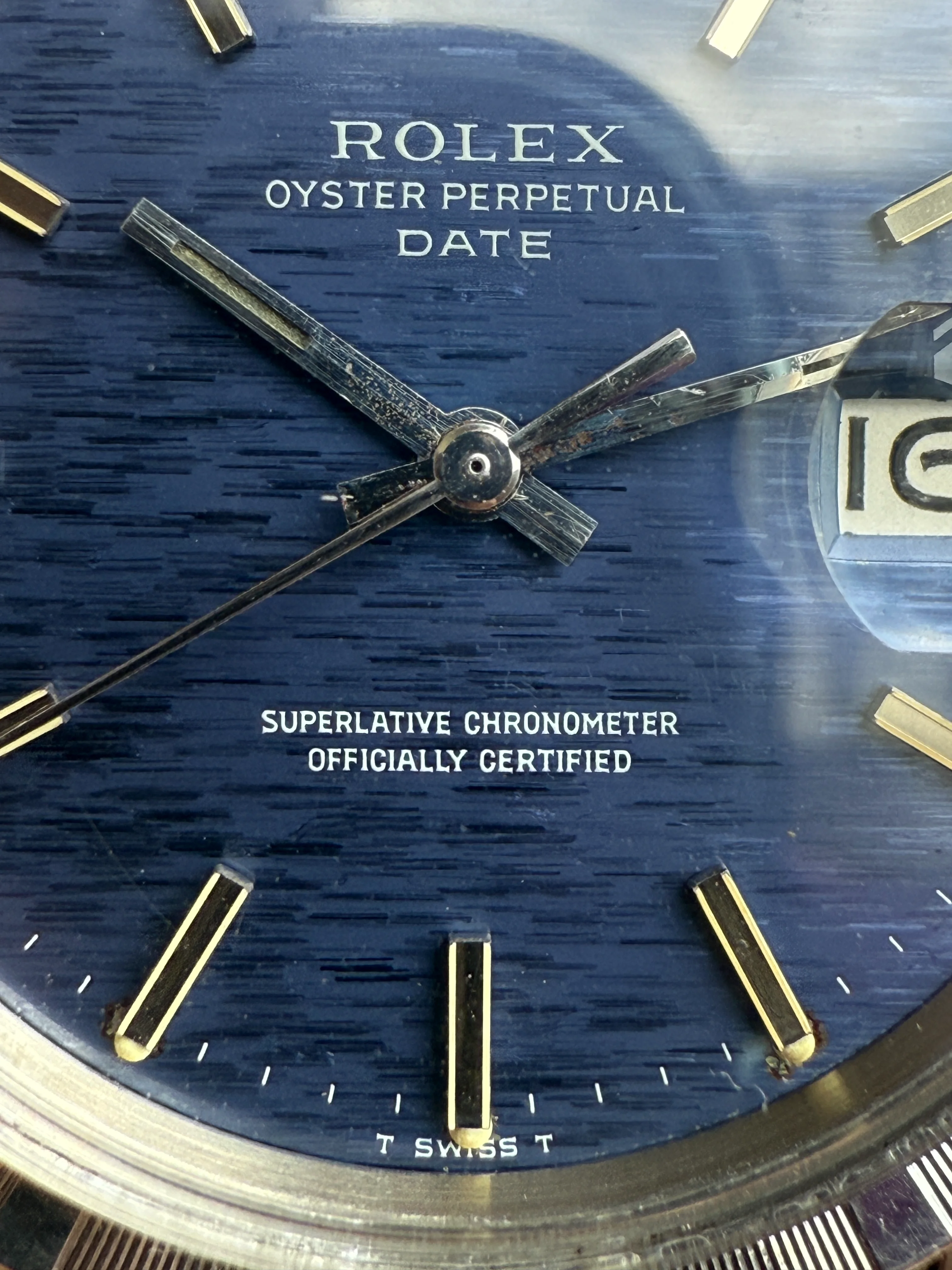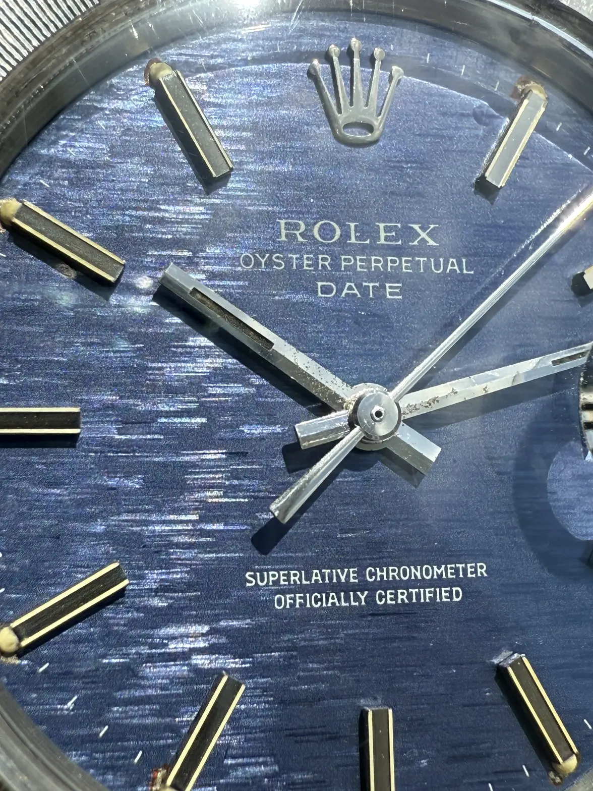 - Dial: Original blue mosaic/shantung/brick dial in very good condition, solid hour markers with lume, baton hands; date at 3; prints, hands, hour markers are all good.