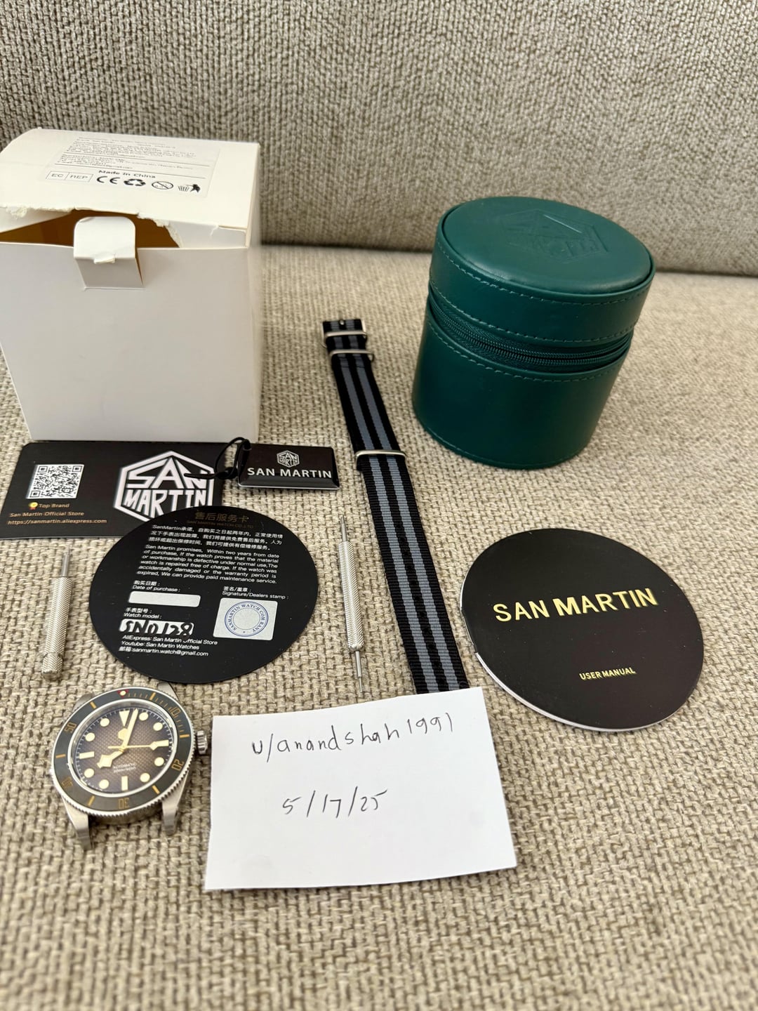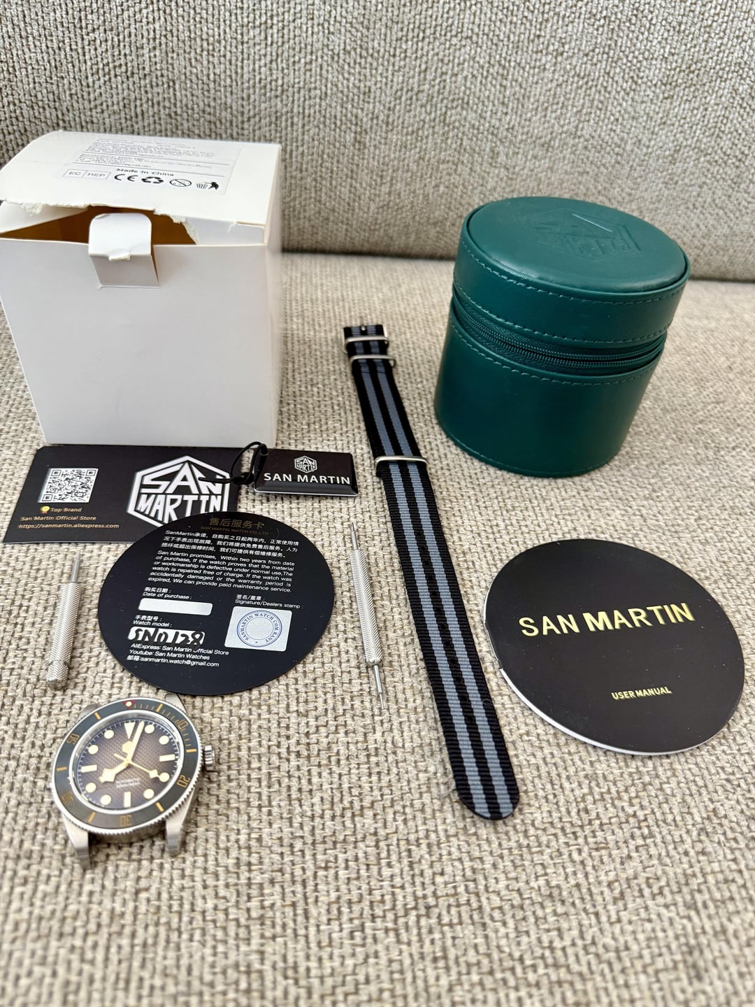 Up for sale is a gently used SAN MARTIN SN0128 with waffle dial. There are no wear marks on dial, case or crystal. Comes with a brand new Bond style NATO strap, original box, booklets and tools Quick Specs: MSRP: $250 plus tax and duties Ref #: SN0128 Case Material : Stainless steel Diameter : 40mm Lug to lug: 47mm Thickness: 11.5mm Glass: Sapphire crystal Dial: Black fume waffle dial Movement : NH35 200m water resistant References: please check out my feedback https://watchcharts.com/repcheck/watchuseek/anand.shah1991/feedback AND https://watchcharts.com/repcheck/reddit/anandshah1991/feedback I’m asking $125 shipped which is more than 50% off retail. Price includes shipping from NJ (within CONUS, fully insured), international shipping available at buyer’s expense. Zelle preferred, wise, venmo, PP also accepted No trades at this time I am very. Comfortable with FaceTime and in person meet up