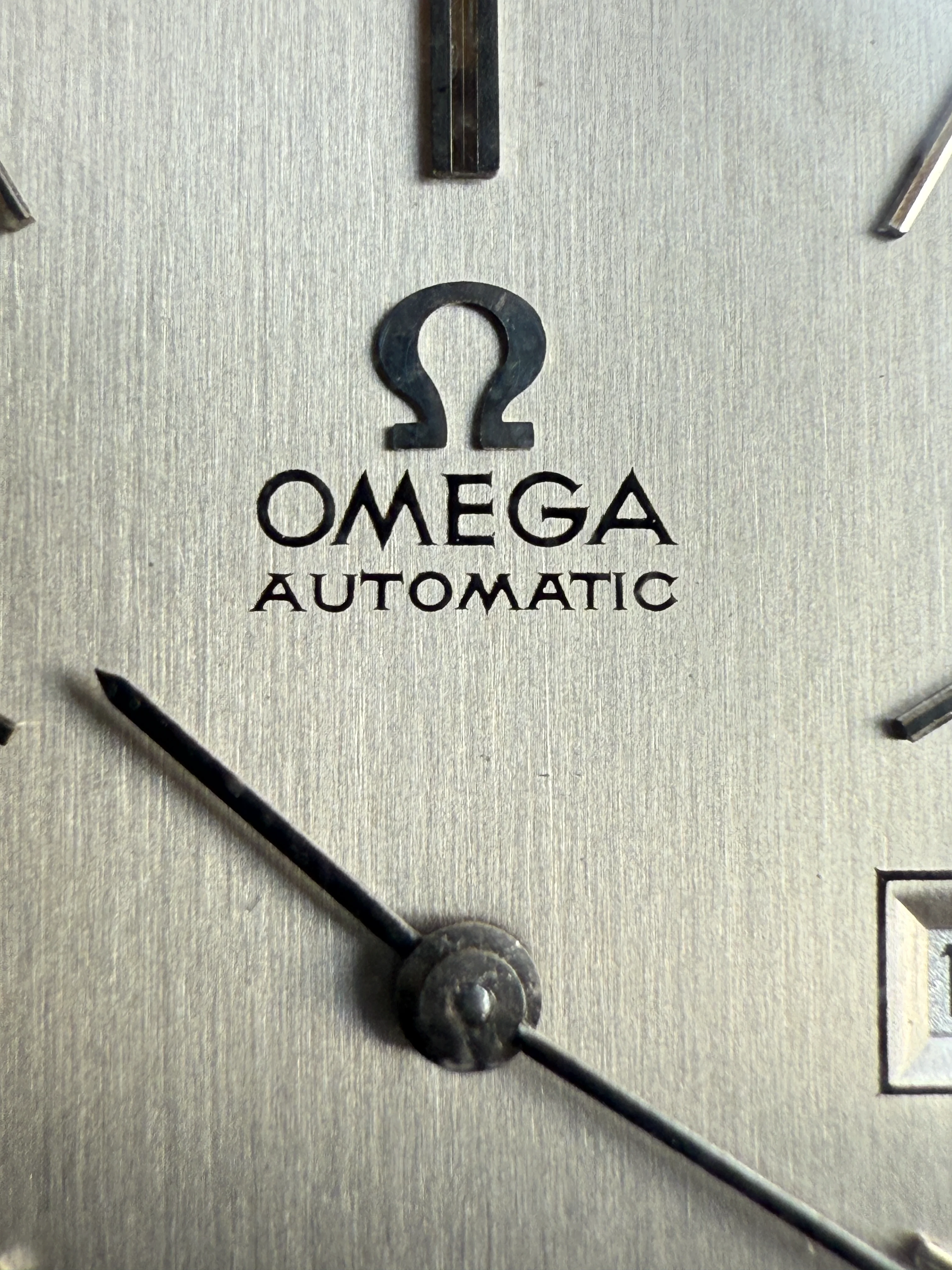 - Dial: Original silver vertical brushed dial, so good, no visible defect. Applied Omega logo, date-aperture frame at 3; black painted hour markers; thin black pin hands; prints, hands, hour markers are all good.
