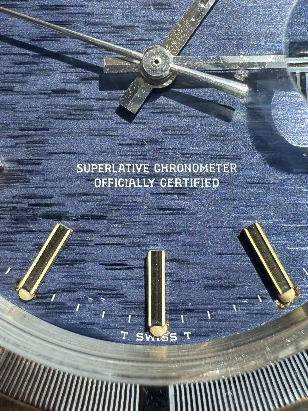 - Dial: Original blue mosaic/shantung/brick dial in very good condition, solid hour markers with lume, baton hands; date at 3; prints, hands, hour markers are all good.