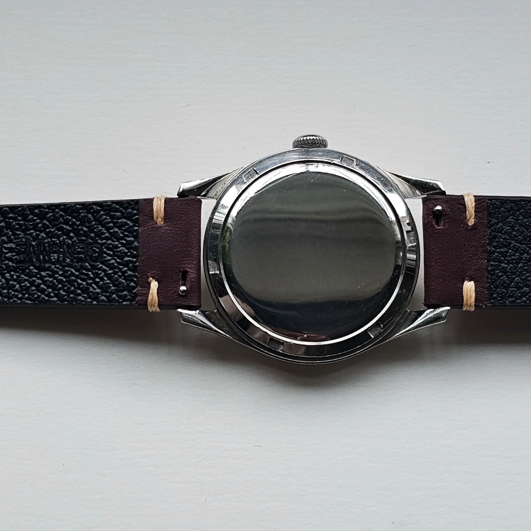 Serviced in March 2025 by my watchmaker. Comes on either brown or black new leather strap.