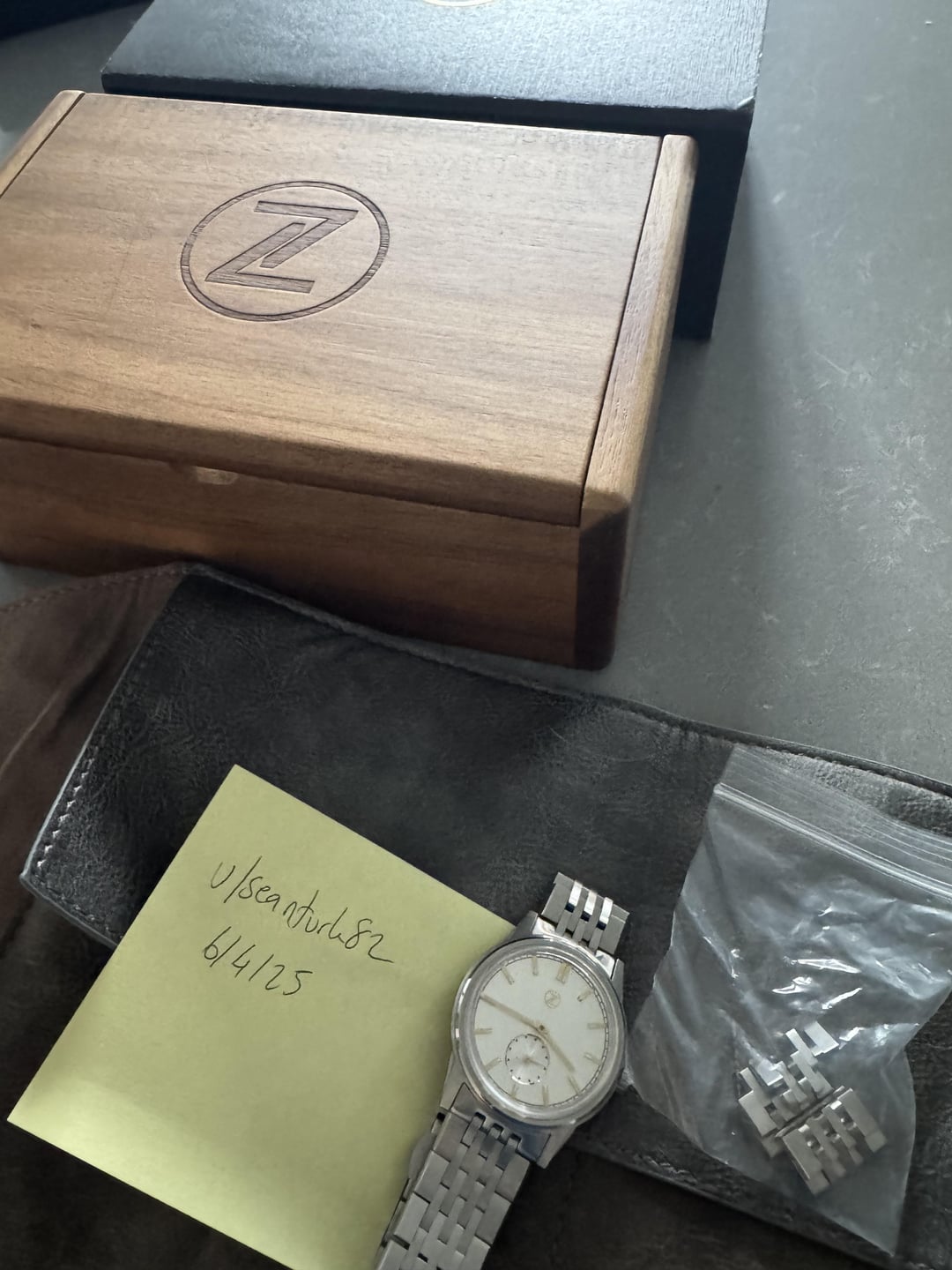 Very very rare sold out model Zelos Nova is up for sale. Honestly, one of the best stainless steel bracelets with the butterfly clasp of experienced over the years. This Watch has reminded me of king seiko as long as i have owned it and felt very similar to the one i own. Sad to let it go but gotta clear up some pieces from collection. This is a buttery smooth Manual wind watch. I am a sucker for manual wind and i am hoping you all love it as well. Price: $849 shipped Condition: Super duper clean, please take a look at the photos and you’ll see as well that the case is clear, the links are clear, and the sapphire is in great shape without blemishes or scratches. 📍 Plano, TX Misssing: leather strap/ selling with bracelet only Includes: watch, wooden box, all links, card dated 8/2020, leather carrying case/pouch Payment: venmo, zelle, pp FF only Please feel free to reach out to me if you have any additional questions or concerns. As usual I’ve described the Watch to the best of my ability and all watches here are sold as is.