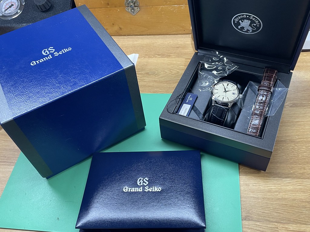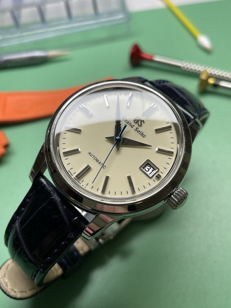 Cream dial is gorgeous and the blued seconds hand is a wonderful touch of color. The watch was purchased by me new from Topper in 2019. It includes the original box and all papers. It has been worn as a dress watch and does have some light surface marks. Includes the original brown GS gator strap as well as a GS Navy gator strap.