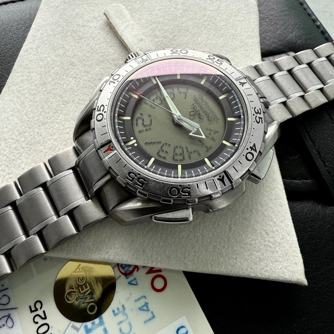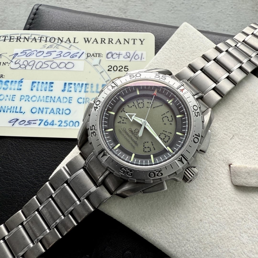 Experience the pinnacle of innovation and precision with the Omega Speedmaster X33, reference 329050. Crafted entirely from lightweight titanium, this exceptional timepiece combines robust functionality with unrivaled performance, making it a true testament to Omega’s legacy in advanced horology. The Speedmaster X33, often referred to as the “Mars Watch,” was created in collaboration with astronauts and aviation experts, designed to meet the rigorous demands of space exploration and professional aviation. First introduced in 1998, this digital-analog chronograph featured the pioneering Omega calibre 1666, offering unparalleled precision and an array of innovative functions ideal for extreme environments. Its role as a trusted instrument for professionals elevated the X33 to a status of technical distinction and rarity. This particular Speedmaster X33 retains its full suite of original documentation, including the box and warranty papers dated 2001—a remarkable feature that adds to its collectible value. Watches from this era that survive with their original accessories are exceedingly scarce, making this a rare opportunity for discerning collectors and enthusiasts alike. # Key Features: * **Full Titanium Case and Bracelet** – Lightweight yet durable, perfectly suited for extended wear and harsh conditions. * **Omega Calibre 1666 Movement** – Combines cutting-edge quartz technology with analog-digital functionality for unmatched versatility. * **Large, Easy-to-Read Display** – Optimized for professional use with exceptional legibility under all conditions. * **Original Box and Warranty Papers** – Includes documentation from 2001, a rare find that enhances provenance and value. The watch is as functional as it is collectible, with features such as mission timing, programmable alarms, and a bold design built for adventure. Whether you're seeking a historical piece of Omega's legacy or a distinctive addition to your collection, this Speedmaster X33 stands out as a must-have. Own a piece of horological history that represents the spirit of exploration and innovation. Don’t miss the opportunity to make this rare Speedmaster X33 yours—crafted to perform, destined to be treasured. **THE DETAILS** **Case:** 42mm Titanium case showing honest signs of previous wear **Dial/Hands:** Original Omega dial is a stunning brand new condition. Hands are like new as they came from the factory. **Caseback:** Original titanium case showing honest signs of previous wear **Movement:** Original Omega Calibre 1666 movement running well **Bracelet/Strap:** Factory titanium bracelet showing honest signs of wear including scuffs on the buckle. The bracelet comes with full links and will fit an 8 inch wrist. **Crystal:** Original sapphire crystal in attractive condition **Accessories:** The watch comes with everything in the photos including the box, warranty card dated 2001, outer box correctly marked with the reference and everything else seen in the photos. These seldom survive with all of the boxes and papers - a true collector's set! Available for sale US$2280