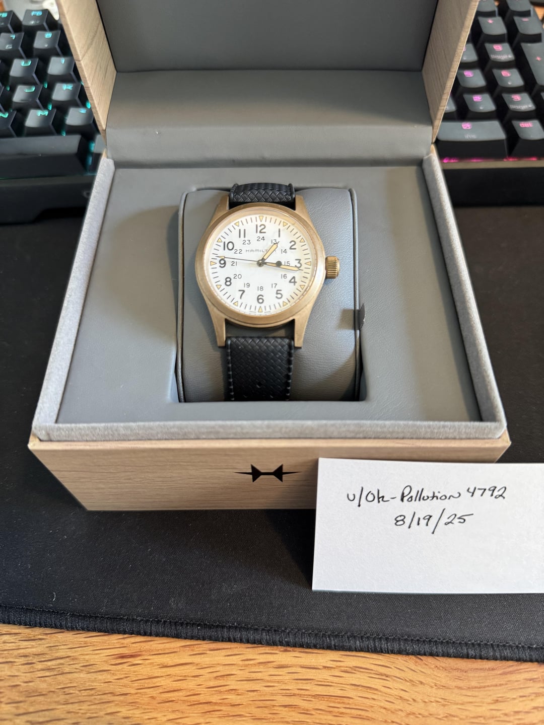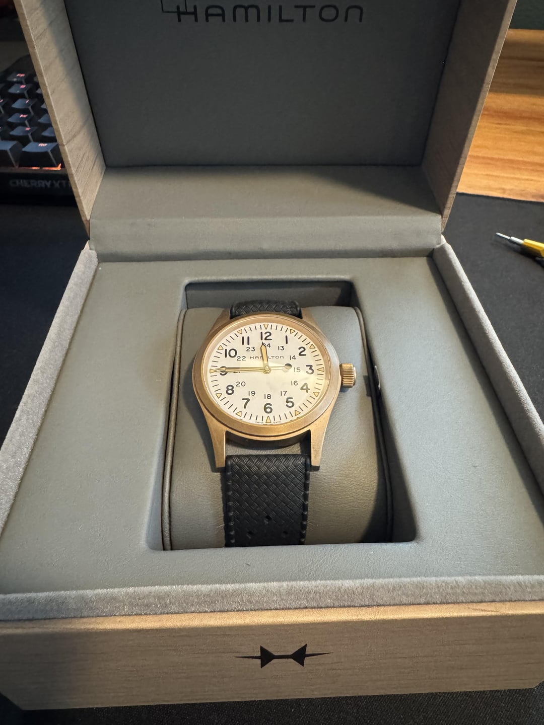 Hello WatchEx, Up for sale is the *Hamilton Khaki Field Mechanical* with the **white dial and bronze/titanium case** configuration (Ref. H69459510). I purchased it here on the subreddit a few months ago; the original buyer purchased it from Teddy in late June 2024. It’s a beautiful piece that’s just not getting the wrist time it deserves, so I’m moving it along. **Condition:** The watch is in excellent cosmetic condition and running strong. It comes as a full kit — inner and outer boxes, stamped warranty card, and the original leather NATO strap (unworn, with tags still attached). Also including three extra straps (all pictured). Even matched the buckle on the rubber strap. **Specifications:** · Reference: H69459510 · Caliber: H-50 · Movement: Mechanical · Case size: 38mm · Thickness (mm): 9.6 · Case material: Bronze and Titanium · Crystal: Sapphire · Lug width: 20mm · Power reserve: 80 hour · Water Resistance: 5 bar (50m)/73 psi (164ft) · Nivachron: Yes **Price:** $550 shipped CONUS **Payment:** Paypal F&F or G&S (+3%) accepted. Not currently interested in trades at the moment. Thanks for looking, please PM or comment if you have any questions or concerns! (if this looks similar to the last time it was posted I used his format and edited)