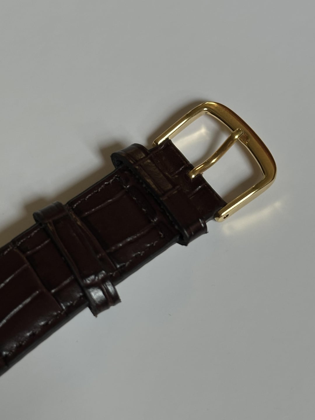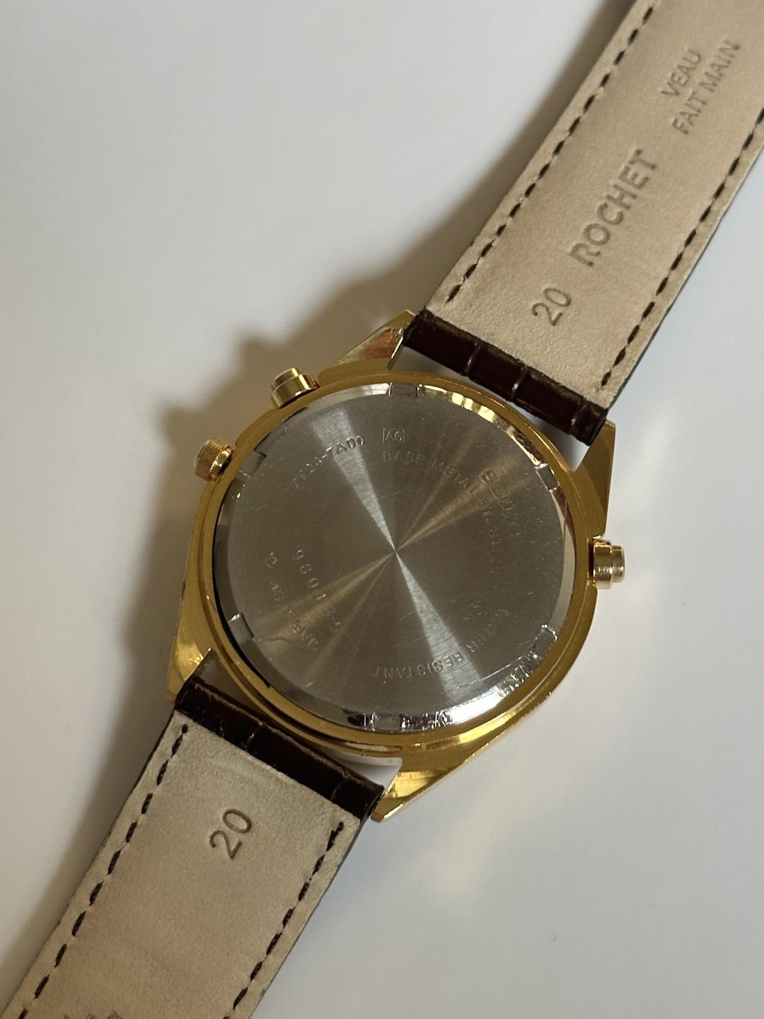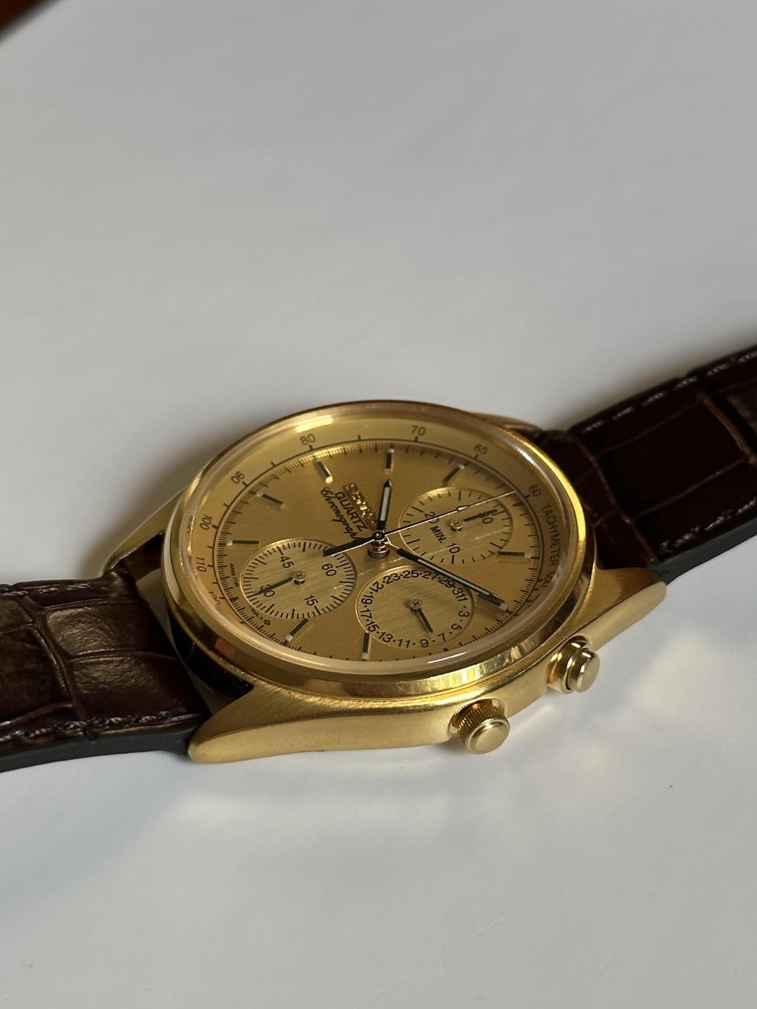 💵 Asking: $220 📦 Worldwide shipping included Reference: Seiko 7T24-7A00 Movement: Seiko Quartz Chronograph (7T24) Case Size: 38 mm (without crown) Dial: Champagne gold (chrono minutes, running seconds, 24-hour) Case Material: Gold-tone stainless steel Crystal: Original flat mineral glass Functions: Chronograph (up to 12 hours), 24-hour indicator, quick-set date, tachymeter scale Strap: Brown leather (aftermarket) Condition: Good vintage condition light signs of wear consistent with age