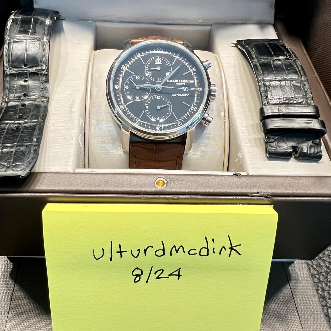 Good morning! Long time listener, first time caller. Today I’m selling my trusty and very handsome 42mm Baume & Mercier (ref. MOA08589) that I’ve really enjoyed having in my collection. I replaced the strap with a new Baume & Mercier brown alligator strap a couple of year ago and have only worn a few times since then. I will be including the original Baume & Mercier black alligator strap pictures as well. Please review the pictures. This watch has been used as you can tell and does have some small nicks here and there. The watch box is also the original box so it does also have signs of wear and it isn’t perfect. I have over 300 positive transactions on r/GunAccessoriesForSale and over 400 transactions on eBay with a 100% positive feedback rating since 2001. I’m asking ~~$800~~ $750 OBO shipped, insured, and signature required. I’m located in San Antonio, TX and I can meet locally. I accept Venmo, Apple Pay, Cash App but being new here I’ll also accept PayPal Goods & Services. Please let me know if you have any questions or require more pictures. Thank you.