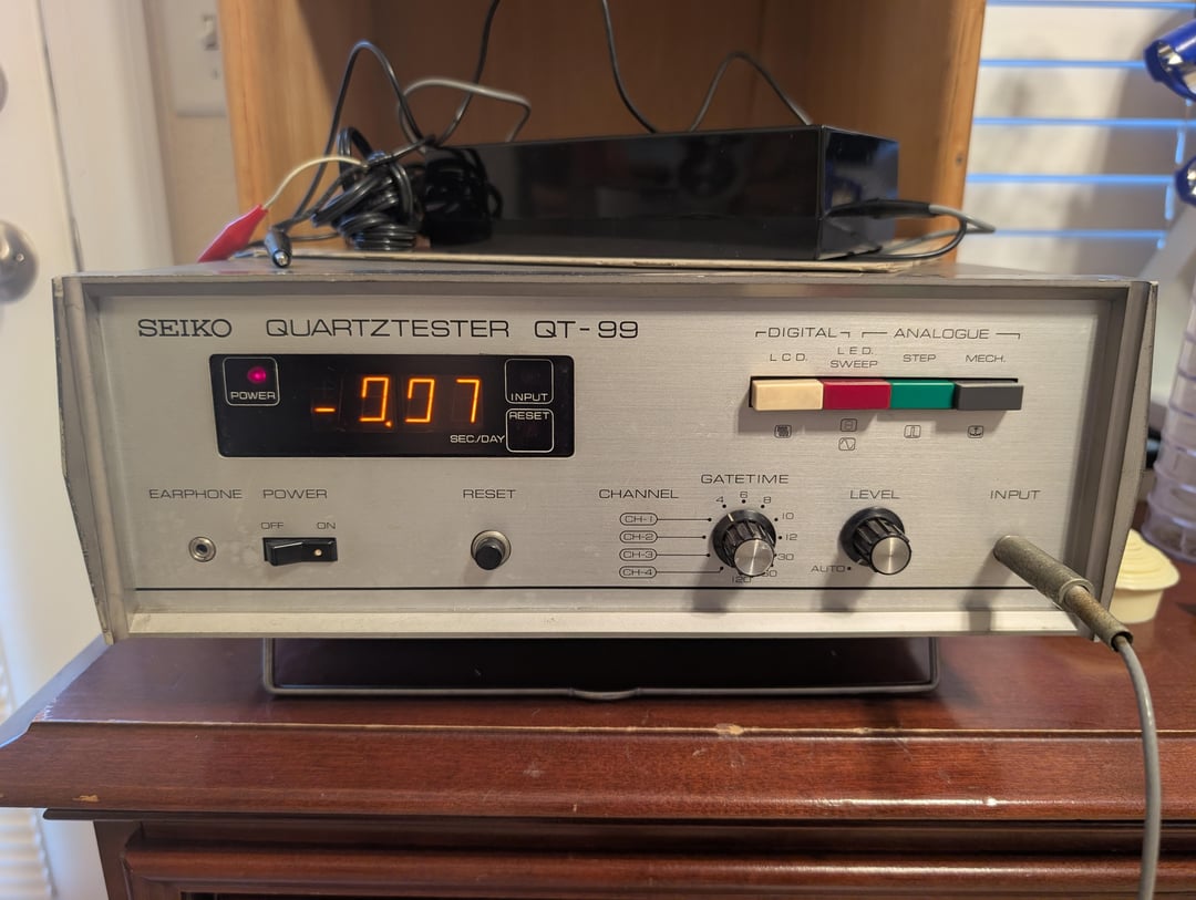 For sale today is my Seiko QT-99. This is a high performance quartz tester designed in the early 70s in order to meet new demands for quartz testing. The design is proven to be incredibly reliable and easy to maintain/calibrate. These machines are still in use at Seiko today! Cosmetically this example is in good condition. Some discoloration is present throughout the case. Electronically all functions are normal. 2 or the display segments are not working; however, the display is still perfectly readable and replacements are easily sourced on eBay for around $20 each. Replacing the display will not require soldering or deep disassembly. The unit will include its original instruction manual in Japanese, pickup for stepper motor quartz and LCD watches, and a divider accessory useful for timing mechanical or tuning fork clocks. I'm asking $499 shipped CONUS for this piece. International shipping at buyer's expense. PayPal G&S is available at my discretion. Thanks for reading!