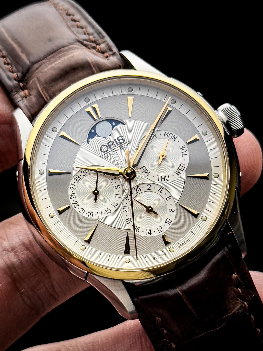 Up for sale is the Discontinued Oris Artelier Complication 7592 40mm in excellent condition. Photos: https://imgur.com/a/cwigWBn Video: https://imgur.com/a/Sh3TiuJ Timestamp: https://imgur.com/a/G8xcHb4 The Oris Artelier Complication Ref. 01 582 7592 4351-07 5 21 70FC is a discontinued piece that manages to pack in some of the most useful complications without ever feeling cluttered. At 40mm, the case wears beautifully, slim enough to slide under a cuff, yet with enough presence to feel substantial. The yellow gold PVD bezel against the silver dial gives it a touch of warmth that balances the otherwise clean, modern design. On the dial you’ll find subdials for day, date, a second 24-hour time zone, and a moonphase at 12 o’clock , practical information presented in a layout that stays symmetrical and easy to read. Powering it is the Oris Calibre 582 automatic movement, offering a 38-hour reserve and visible through the caseback. The watch comes fitted on a brown leather strap, which plays nicely against the gold bezel, making it versatile enough for both formal and casual wear. The watch is in excellent condition showing minor hairline scratches on the case and the caseback. The crystal is flawless, with clean bezel, clean dial and case. Watch comes fitted on original straps and buckle with almost no creases. The watch has been serviced, so it’s keeping excellent time at +/-5s a day. Watch comes with original Oris box no papers. Price: $1025 + $35 (via DHL/ UPS express). Express shipping cost me 60- 80 USD. Payment via PayPal F&F or G&S (+4.6% fee paid by the buyer). Not accepting trades. Feel free to message me with any questions or if you’re interested. Have a great day! Check out my other watches on Instagram: @jasonswatchcorner