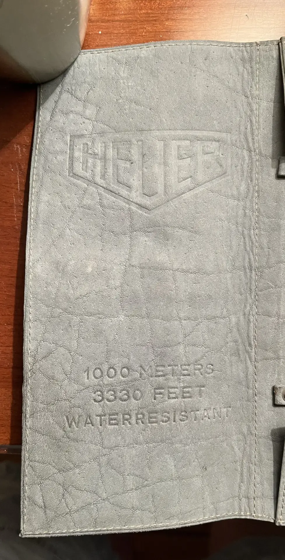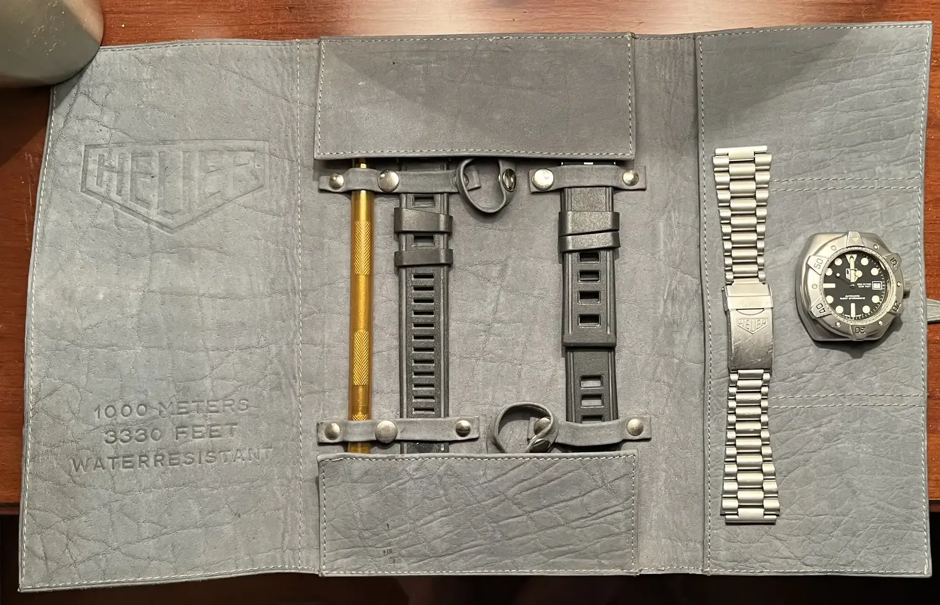 The Super Professional is an unbelievable watch, a 1000m rated diver in a bead blasted monocoque Heuer signed case with a President style bracelet including a flip-lock clasp and wet suit extension. The movement is an ETA 2892, which is running nearly spot on when compared to my iPhone 13, which is pretty decent for a 40+ year old watch. The dive kit is beyond rare. It is a leather pouch, signed Heuer on both the buckle and inside the sleeve. The ISOfrane strap with wet suit extender is there, as is the Heuer branded spring bar tool in its orange tube. These items are typically missing in any of the kits that I’ve come across over the years. TAG dive kits are out there, but the Heuer variant simply cannot be had, and this one is easily the most complete I've ever seen.
