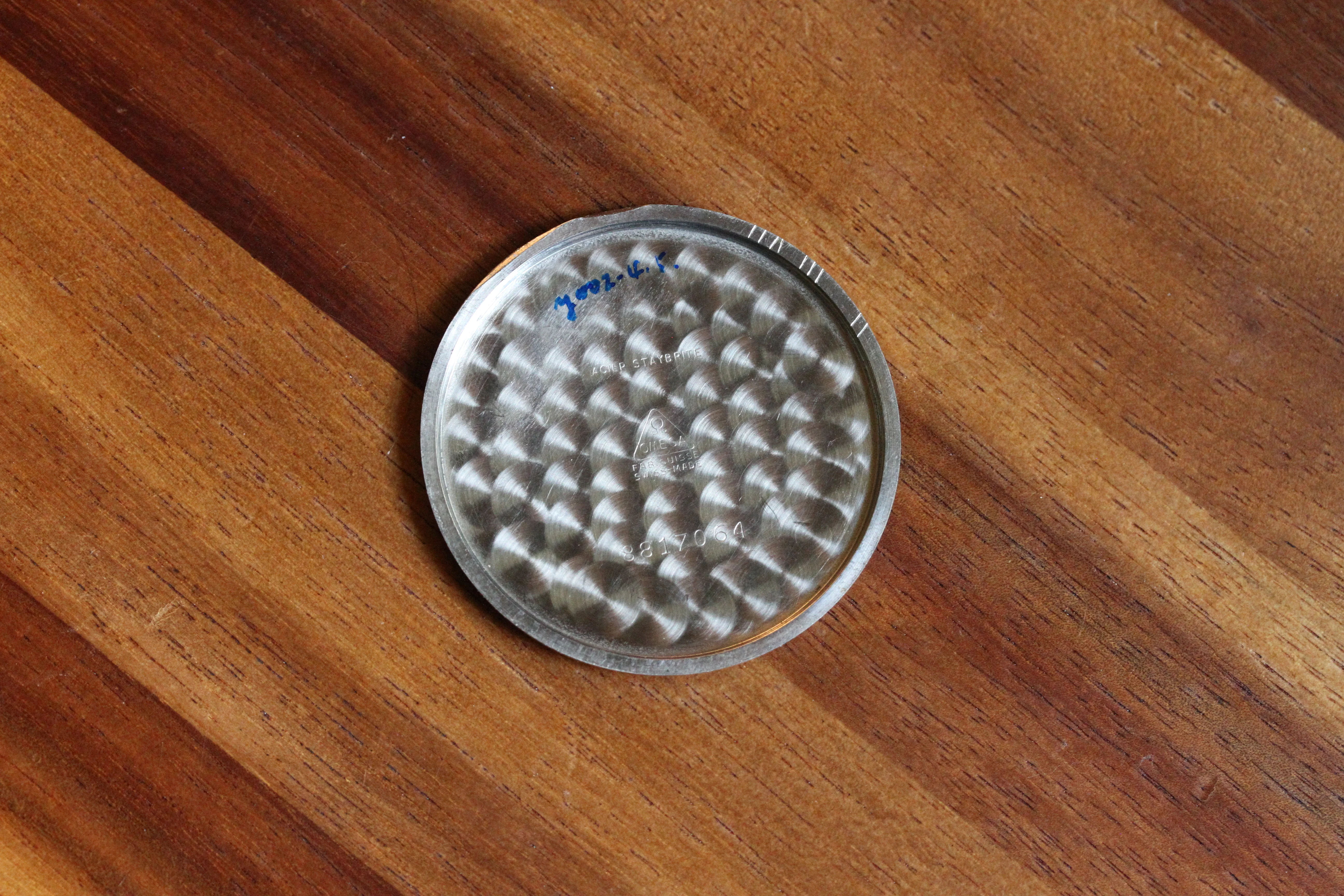 The two-tone crosshair dial is in excellent condition, below lovely blued hands and original crown and bow.