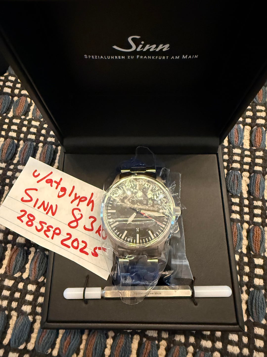 Like new with original box and papers directly purchased from Sinn in Germany. Shipping available from Canada or USA (for customs/duty purposes). Near perfect condition - only very light wear on clasp. Only used for about a month. Includes watch winder shown. Price $2750 CAD / $2000 USD plus half of shipping fees.