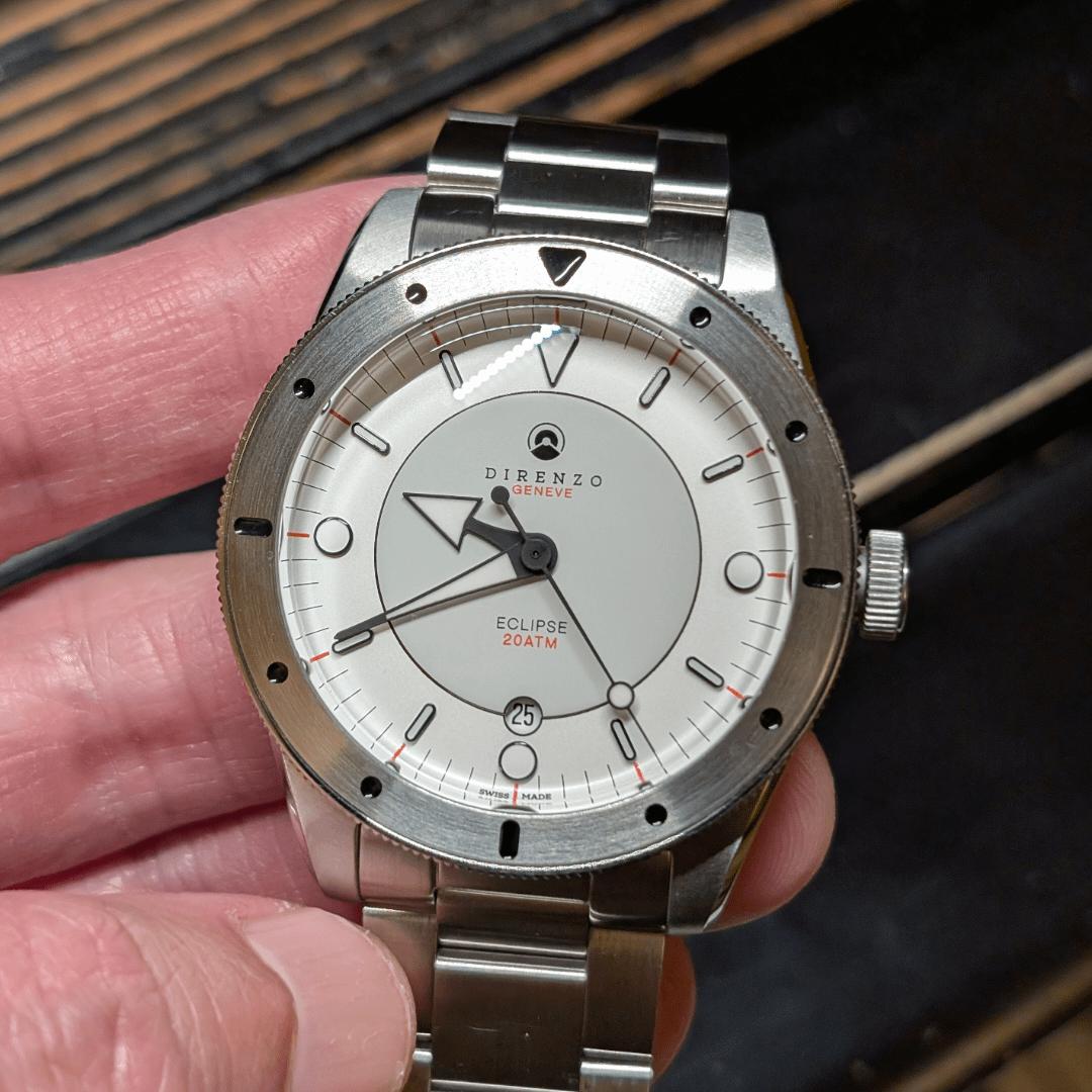 Hi all, I'm wanting to sell my Direnzo DRZ03 (v2) "Eclipse" (SOLD OUT) in the crisp white sector dial with dove gray center, steel bezel. It's a unique robust dive watch that can dress up or down. Watch itself is in great condition, the bracelet has normal surface wear. Still under the 2 year warranty with 1 year left! The watch runs great, around +5s per day. All links, warranty card, watch roll included. I also have the original cardboard box if interested (not pictured). More pics/video upon request. Asking US$600 including Continental U.S. shipping. PayPal please. Add 4% for G&S. Specifications: 40mm diameter Sellita SW 200-1 Elaboré w/ Incabloc 20mm lugs 48 L2L 20ATM WR w/ screwdown crown BGW9 Superluminova that's bright and long lasting