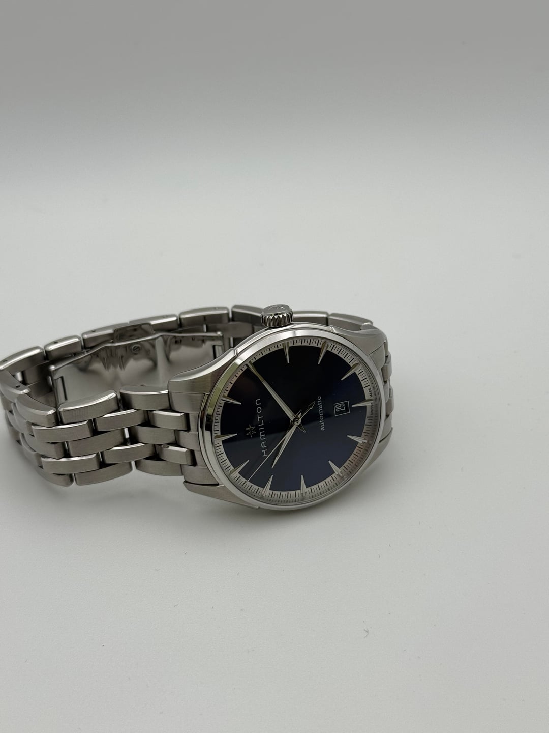 Beautiful elegant watch with the Hamilton h10 movement with nice polished bracelet and very reflective all around. Very hard to photograph lol. There is a minor barely visible scratch you have to go up close to see. Comes with travel case, papers, and warranty purchase date is march of this year so plenty left. Until 2027 Asking $500+🏷️obo Timestamp: https://imgur.com/a/zIA4QQR Product page: https://www.hamiltonwatch.com/en-us/h32475140-jazzmaster-auto.html