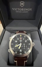 For sale I have two pilot watches from Victorinox. I bought both years ago, and had them both serviced in 2022 by Victorinox (paperwork included). They are in great condition, and virtually indestructible. Both have brand new batteries as well (need replaced about every 2 years or so). Both have their chronometers’ seconds measured on the central hand, and their minutes are measured with a second central hand making the elapsed time very easy to read. Both also measure 1/10 of a second with a big eye register. Please read the Watch Hunter links for both as these are truly unique watches. The first watch is the Victorinox Swiss Army Airboss Mach 3 – 60/60. I am asking $450 or best reasonable offer. Read about it here: https://www.watchhunter.org/2021/02/meet-the-watch-victorinox-swiss-army-airboss-mach-3-60-60-chronographs.html. All steel case, and comes on a steel brand new OEM bracelet with all links. This is the most comfortable bracelet, the multi links help it mold to any shape. Also included is an OEM brown leather strap and deployant clasp and the original leather strap and pin buckle (stitching has come undone on part of it). 43mm case, 22mm lug width, 52mm lug to lug and 12mm thick. The second watch is the Victorinox Swiss Army Ground Force 60/60 Chronograph. I am asking $395 or best reasonable offer. Read all about it here: https://www.watchhunter.org/2020/04/meet-watch-victorinox-swiss-army-ground-force-central-minutes-chronograph.html. This has a titanium case, 44mm case, 22mm lug width, 52.5mm lug to lug and 13mm tall. It comes on a brand new OEM leather strap and deployant, but I also will include the original rubber bracelet and pin buckle (the rubber has started to crack). I should note, that although they measure large, I have a 6.8” wrist and for me the fit very comfortably, but with a lot of wrist presence. Neither are too thick which helps keep them comfy.