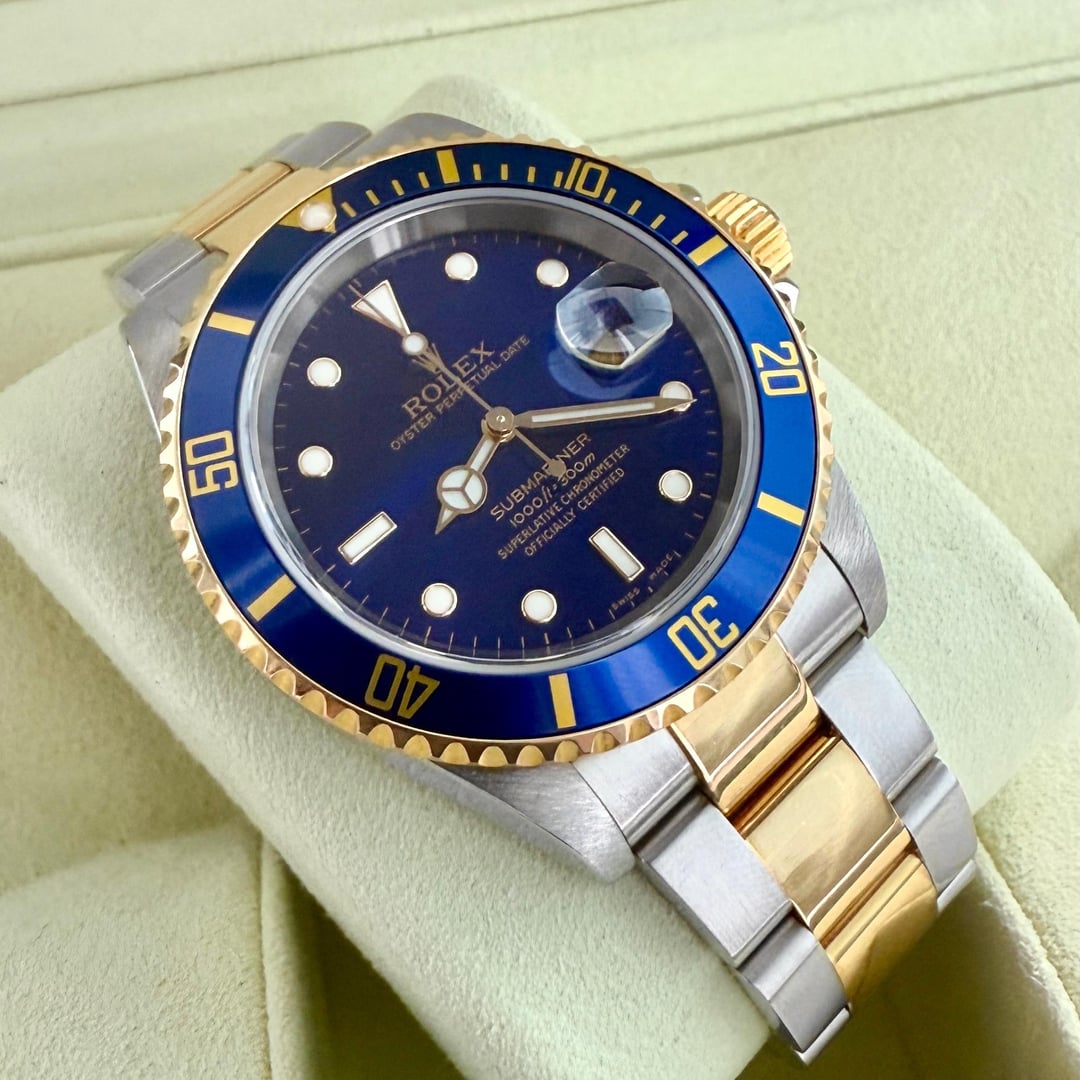 The Rolex Submariner Two-Tone, reference 16613 LB, affectionately nicknamed the 'Bluesy,' is an iconic timepiece that exudes both luxury and performance. Its striking blue dial, framed by a matching blue aluminum bezel, stands in perfect harmony with the two-tone combination of 18k yellow gold and stainless steel, creating a sophisticated yet bold aesthetic. This particular reference showcases the pinnacle of craftsmanship for the 16613 series, featuring significant upgrades that set it apart. It boasts a no-holes case for a sleeker profile along with an improved bracelet with solid end links that enhance both comfort and durability. These advanced features make it the finest iteration of this reference prior to the introduction of its ceramic successor. Adding to its allure, the Rolex 16613 has been discontinued, further enhancing its value and desirability among collectors.  Whether you're drawn to its distinctive blue dial, its meticulous craftsmanship, or its status as a discontinued reference, the Rolex Submariner 'Bluesy' 16613 is a treasure of horological artistry. It’s a rare opportunity to own an heirloom-quality piece, forever blending elegance, durability, and exclusivity. THE DETAILS * Case: 40 mm stainless steel case which shows light signs of previous wear post the 2021 Rolex service * Bezel: Original solid 18k gold bezel in sharp and attractive condition with sharp teeth, many of these submariners have weak/over polished bezels which wears on the teeth though this one is sharp and crisp * Caseback: Attractive stainless steel in attractive condition * Dial/Hands: Original Rolex vibrant blue dial which is in stunning condition. Hands are attractive and original * Bracelet/Strap: Original Rolex oyster stainless steel + 18k solid gold middle links which shows light signs of previous wear post the 2021 Rolex service. This bracelet does not show signs of stretch which is a nice bonus as it is nice strong bracelet. The clasp is marked MA3 dating the strap correctly to March 2005. The strap will fit an 7.8 inch wrist   * Movement: Rolex Automatic winding movement which has been serviced by Rolex in 2021 and is currently running +3 seconds per day.  * Crystal: Sapphire in attractive condition with no distractions * Accessories: The watch comes with everything seen in the photos, including box, outer box, Rolex seal, Rolex polishing cloth,  2021 Rolex service card, and everything else seen in the photos.  Available for sale $9995