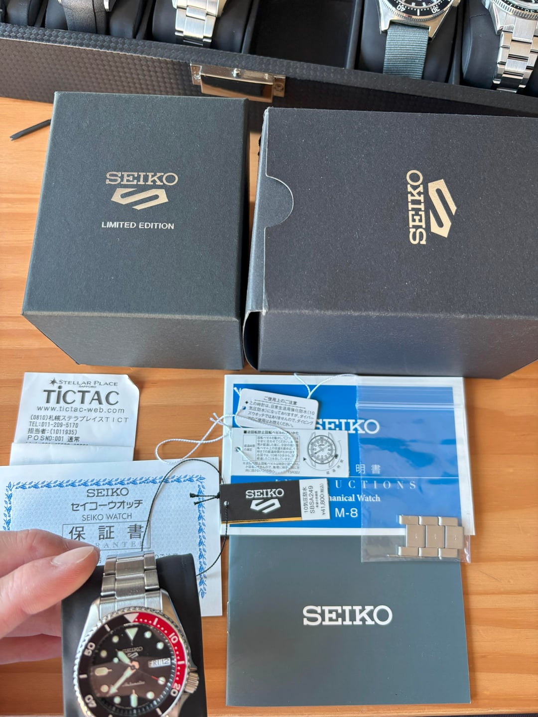 Please see the details below. I am the original owner and purchased directly from the TiCTAC store in Sapporo. Model: Seiko 5 SKX JDM TiCTAC Limited Edition Color: Black / Red; “Coke” Reference Number: SBSA249 Specs: * Case Size: 38mm * Automatic Caliber: 4R36 * Power Reserve: \~ 41 hours * Accuracy: +45 seconds to -35 seconds per day * Lug width: 20mm * Crystal: Hardlex * Water Resistance 10bar Purchase Year: Dec 2024 Purchase History: TiCTAC retailer Includes: Full Kit (box, papers, full links) Condition: 9.5 / 10; Do not see any blemishes on the watch. Very minor marks on lugs from occasional strap changes. **Asking Price: $400 + shipping** **No Trades** **Shipping CONUS only** **Local Pick Up OK**