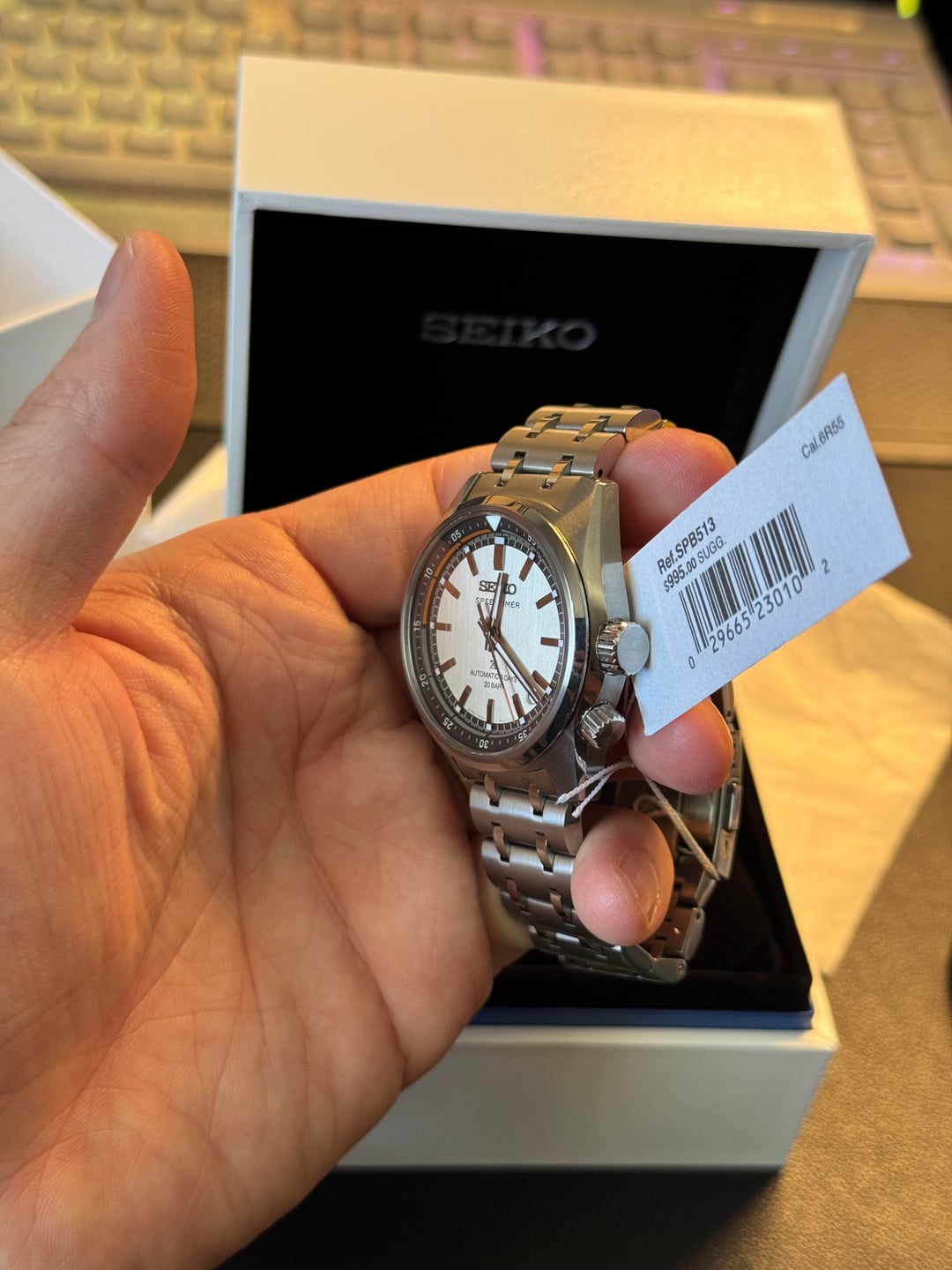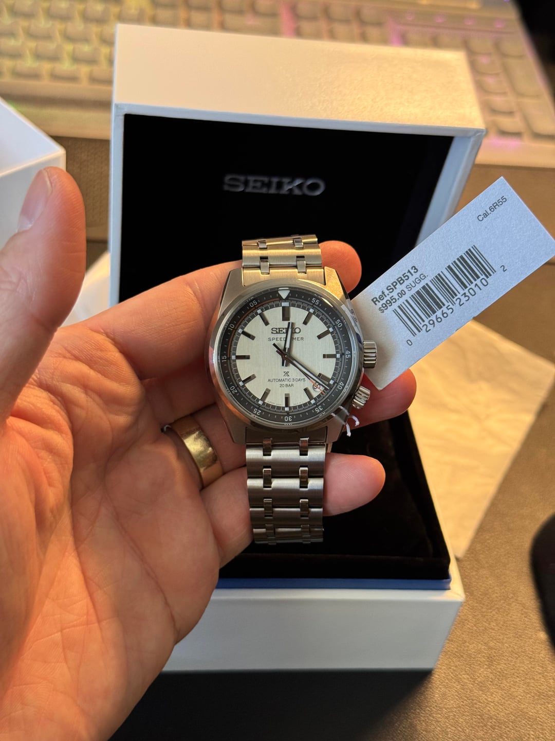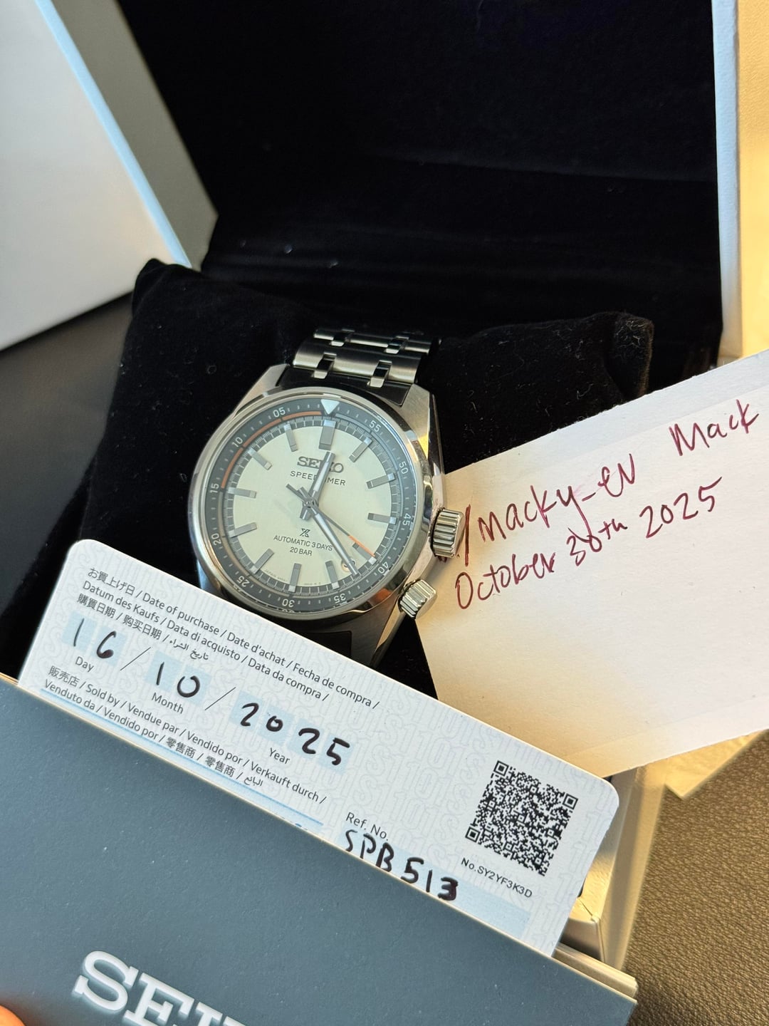 FS is the newly released Speedtimer from Seiko in the brushed cream dial variant. Couple weeks old - like new. **Condition:** * **Case, bezel, and crystal:** 9.9/10 * **Accuracy:** \-2 to +2 a day **Full Kit:** * Manuals warranty * Mid October 2025 purchase date * OEM steel bracelet **Specifications:** * **Model:** SPB513 * **Case size:** 39m * **Thickness:** 12m * **Lug-to-lug:** 44m * **Case material:** Stainless steel * **Crystal:** Saphire * **Movement:** Seikio 6R55 * **Water resistance:** 200m * **Bracelet:** OEM bracelet **Price & Terms:** * **Price:** $780 shipped CONUS only. Shipping from LA California. * **Payment:** Zelle preferred