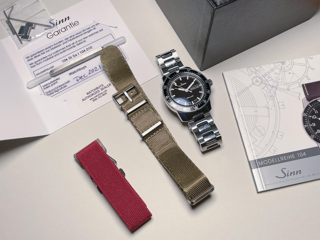 Sinn 104 Black w/ box and papers for sale. Includes all original links (sized for 8.5” wrist with one link leftover), one maroon MN strap, one Crown & Buckle Supreme NATO in Cypress (super nice, barely worn), and original cards and paperwork etc. Was running a bit fast when I bought it and had it regulated, see timegrapher pics. No egregious wear other than on the clasp (these clasps are known to be scratch magnets) and a scuff at 12:30 on the bezel. Wears very nicely despite. Let me know if you have any questions. Asking $1200 netTimestamp and more pics: [https://imgur.com/a/msD26Pp](https://imgur.com/a/msD26Pp)