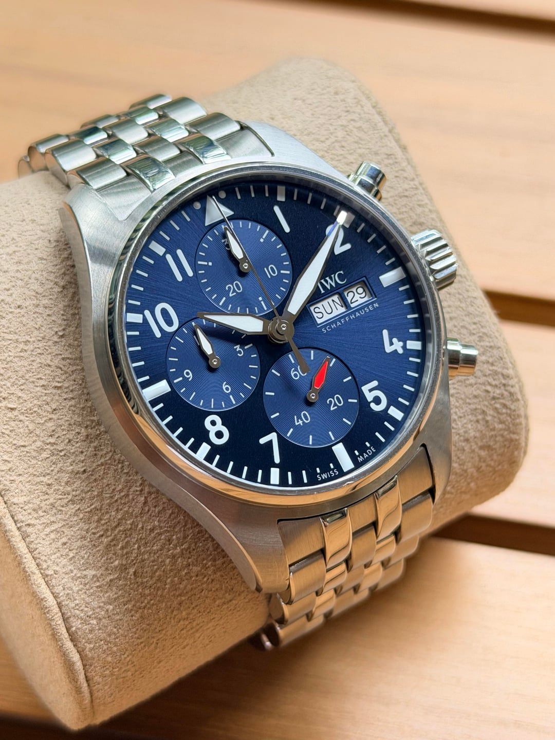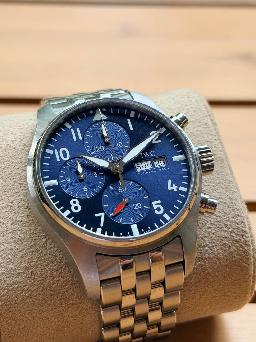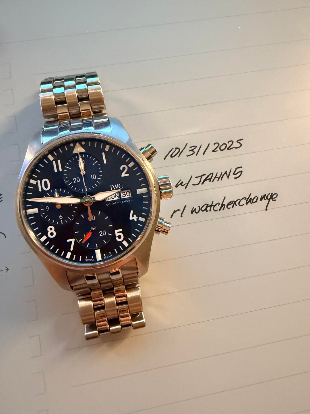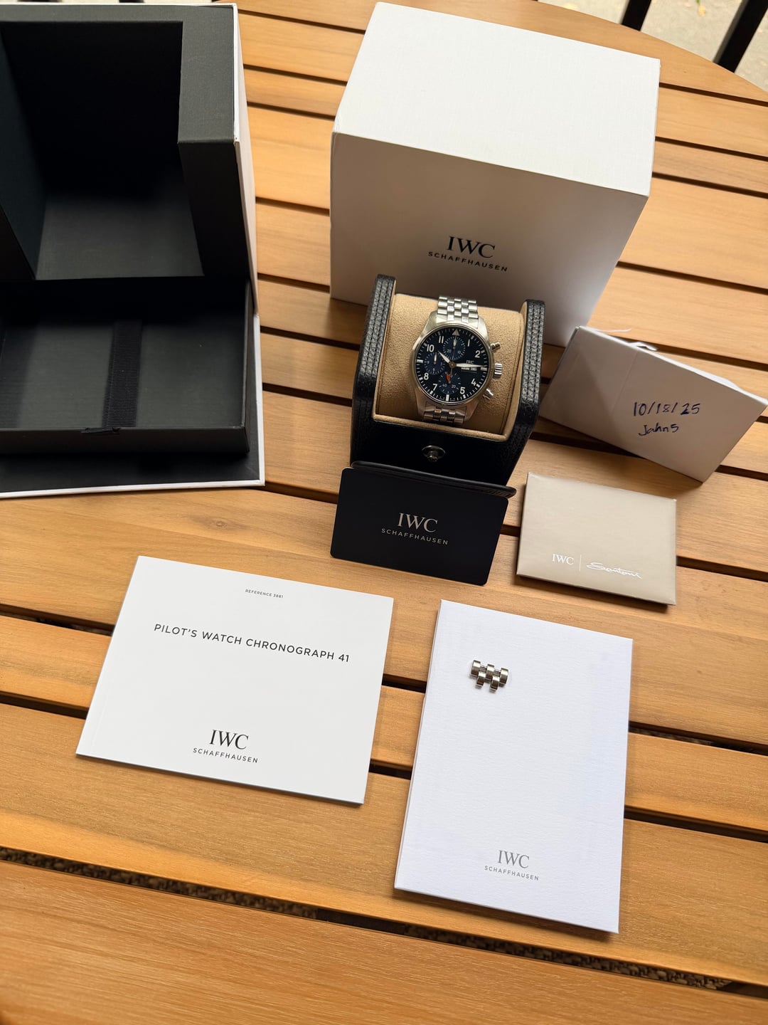 Hi everyone -- up for sale is my IWC Pilot's Chronograph 41. This is IWC's latest model of their famous Pilot's Chronograph with an IWC manufacture movement (unlike the previous iterations, like Le Petit Prince). Full details here: https://www.iwc.com/us-en/watches/pilot-watches/iw388101-pilots-watch-chronograph-41 The IW388101 comes on a blue calfskin strap with EasX-CHANGE system, but this particular version has been upgraded with the famous IWC stainless steel bracelet with arguably the best and most user-friendly bracelet features in the industry, like tool-less link and bracelet removal. The original leather strap is not included. Inside is the beautiful automatic, self-winding, IWC-manufactured movement that is keeping excellent time. I love this watch, but I have found that it does not particularly fit with the way I dress (a lot of muted colors). The watch comes with everything that you see in the timestamp picture. The bracelet will come with an extra "link" (although it's really 5 separate components due to the design). The watch is from 2021. Sale value is $4,800 net to me CONUS only. Local deals around ATL, GA welcome! No trades. This is the lowest comp available — let me know if not, and we can discuss. Always happy to provide references, send additional pictures, or FaceTime. I will ship out within 24 hours of receiving payment/the watch. Payment options are wire or PP F&F for established users with trading history. The watch will be shipped via FedEx, fully insured for the agreed upon price. The watch will be shipped to the nearest FedEx location near you for holding. Thanks!