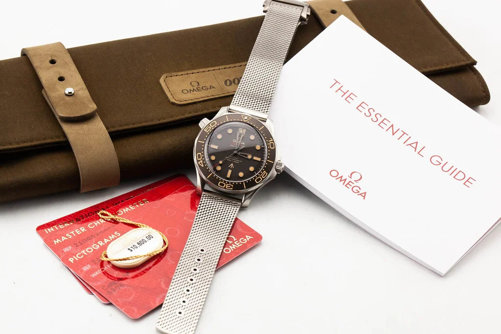 Up for sale is a brand new Omega Seamaster 300 James Bond No Time To Die (NTTD) reference # 210.90.42.20.01.001. It comes complete with all boxes, papers, booklets, leather pouch, hang tag, and 2025 dated Omega Warranty Card.
