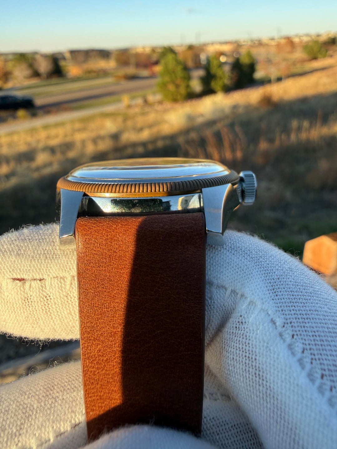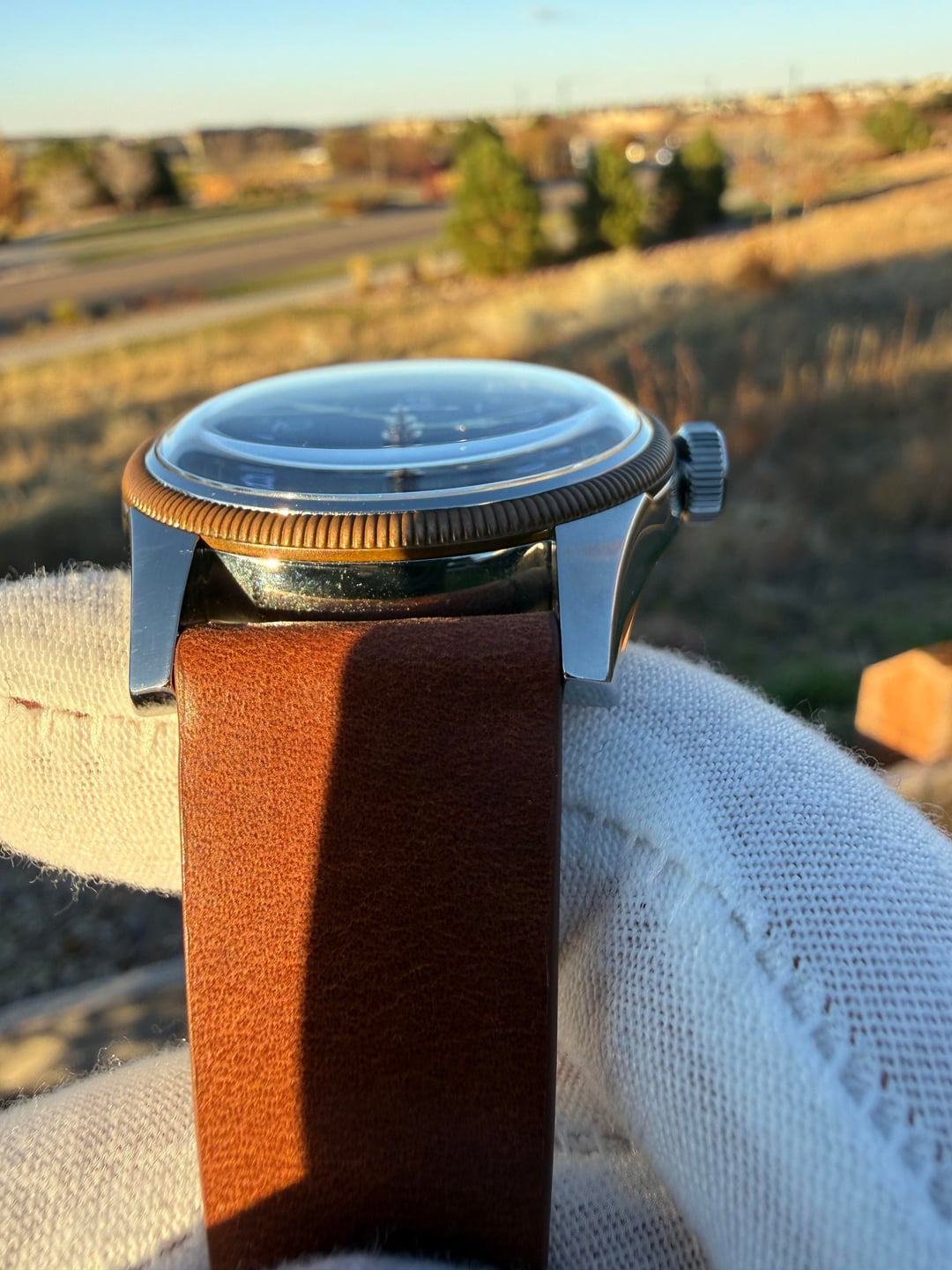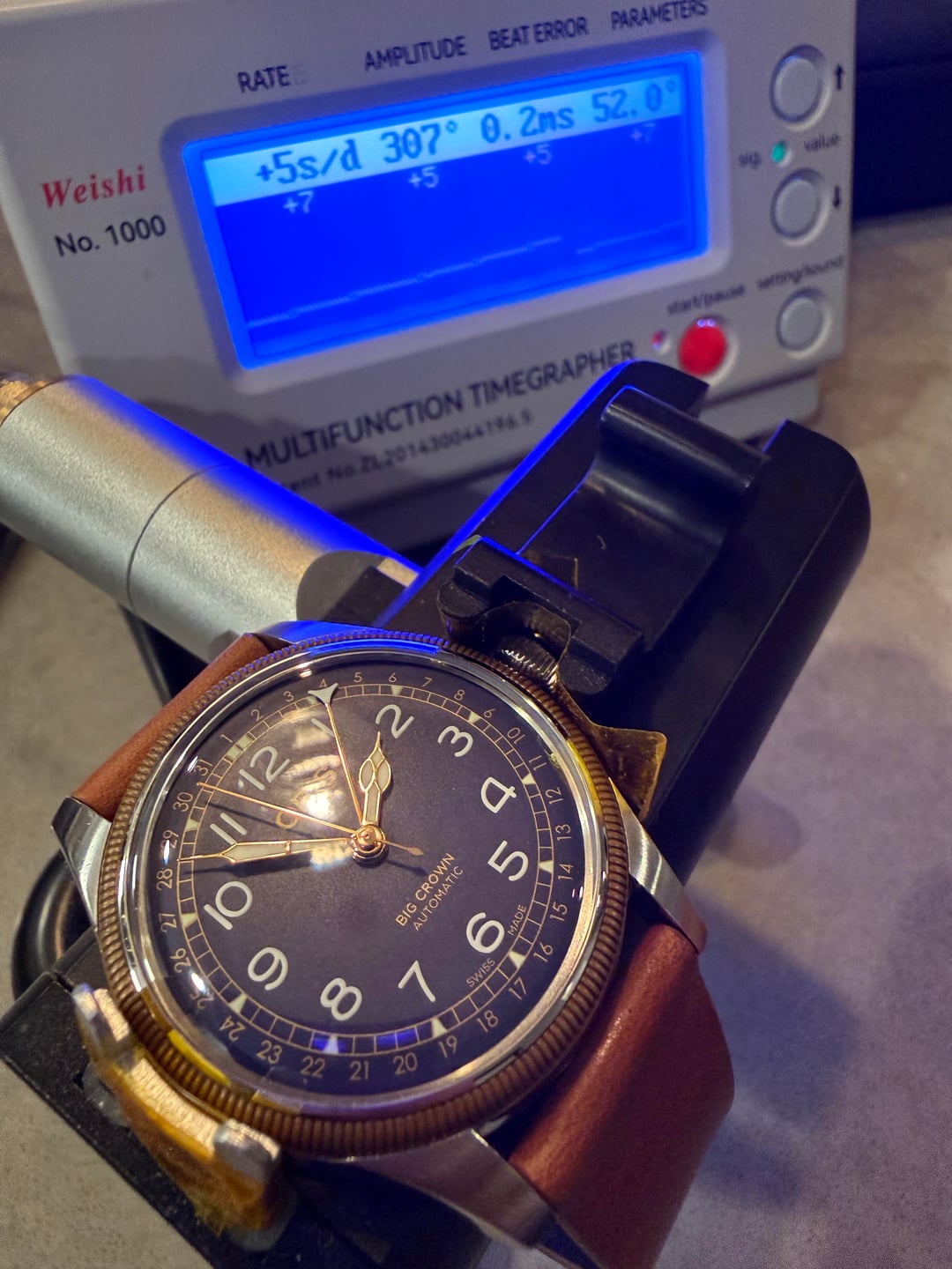 Greetings WatchEx! Up for for grabs is an Oris Big Crown Pointer Date, reference 01 754 7741 4365, in good overall condition. This is the classic 40mm version with the beautiful deep blue dial and bronze bezel. Includes a domed sapphire crystal and signature pointer date complication — a perfect mix of vintage charm and modern build quality. Details: • Model: Oris Big Crown Pointer Date • Reference: 01 754 7741 4365 • Case Size: 40mm • Movement: Oris Cal. 754 (automatic, Sellita SW200 base) • Crystal: Domed sapphire, AR-coated inside • Dial: Deep Blue • Lug Width: 20mm • Water Resistance: 50m • Condition: Very Good – light wear consistent with normal use; really only a few hair lines scratches on polished sides. No major dings or deep scratches. Crystal is clean. • Set: Full set – includes original Oris box, papers, hang tag and warranty card. . Service history is unknown but is running nicely and winds nice and smooth. See included time graphed pic. Price: $1,250 (shipped CONUS) Payment: Zelle or PayPal F&F with significant history or references. Location: Denver, CO More than happy to hop on a FaceTime to show the watch to serious buyers. Tyler me know if you have any further questions and thanks for looking. Cheers!