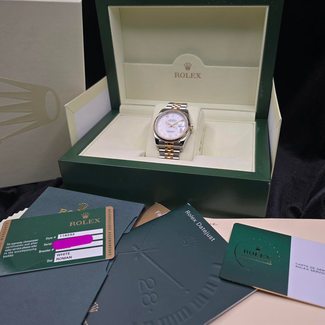 Up for sale here is an excellent example of the classic 36mm Datejust. This one was originally purchased in 2007, and it recently came back from an official Rolex service in 2025- so it’s still under warranty until September of 2027! Ref. 116233. Comes on the super jubilee bracelet with the hidden clasp, and with the full set of original box and papers, as well as the NFC Service card. Asking price is $9,750 **All watches sold by us come with a 1 year warranty on movement, case, and bracelet functionality.** We have been trading luxury timepieces since 2017 and operate out of the southeast United States. Accepted forms of payment are wire transfer, trades for other watches, or crypto +2%. Turn your digital coins and memes to IRL assets! After payment has been received, we ship out promptly using Fedex Priority Overnight, fully covered by a private insurance company. Packages are sent to a Fedex Office or Ship Center to be held for pickup. Armored carrier or personal delivery will be arranged for pieces valued over $150k. More pictures or video available on request! Plenty of references available, so deal with confidence! We pride ourselves on customer service, communication, and will do what you need to make this a comfortable transaction. Most brands and models of luxury timepiece are accepted on trade. Rolex, Audemars Piguet, Patek Phillipe, Richard Mille, Hublot, Panerai, Zenith, Breitling, Vacheron Constantin, F/P. Journe, A. Lange & Sohne, etc. I can do cash either way or multi-watch trades for the right deal! Check out our other listings on mechanical-art . com