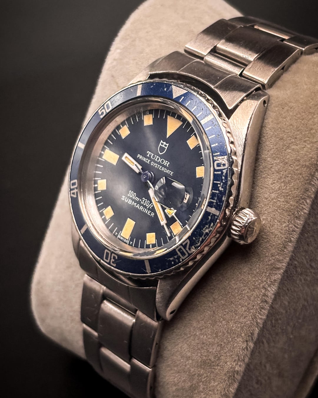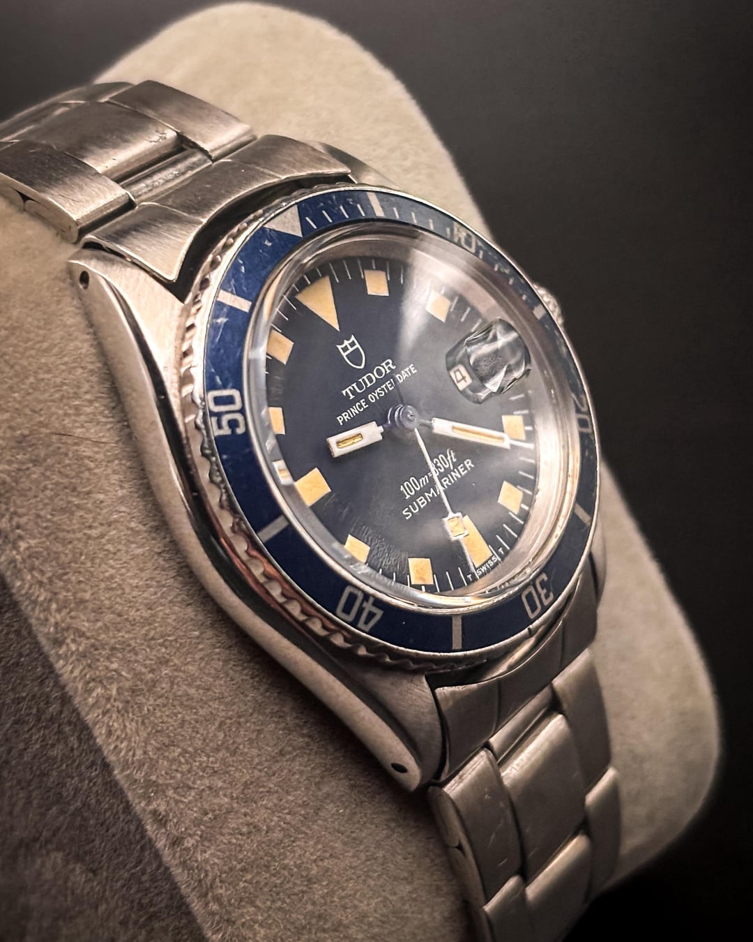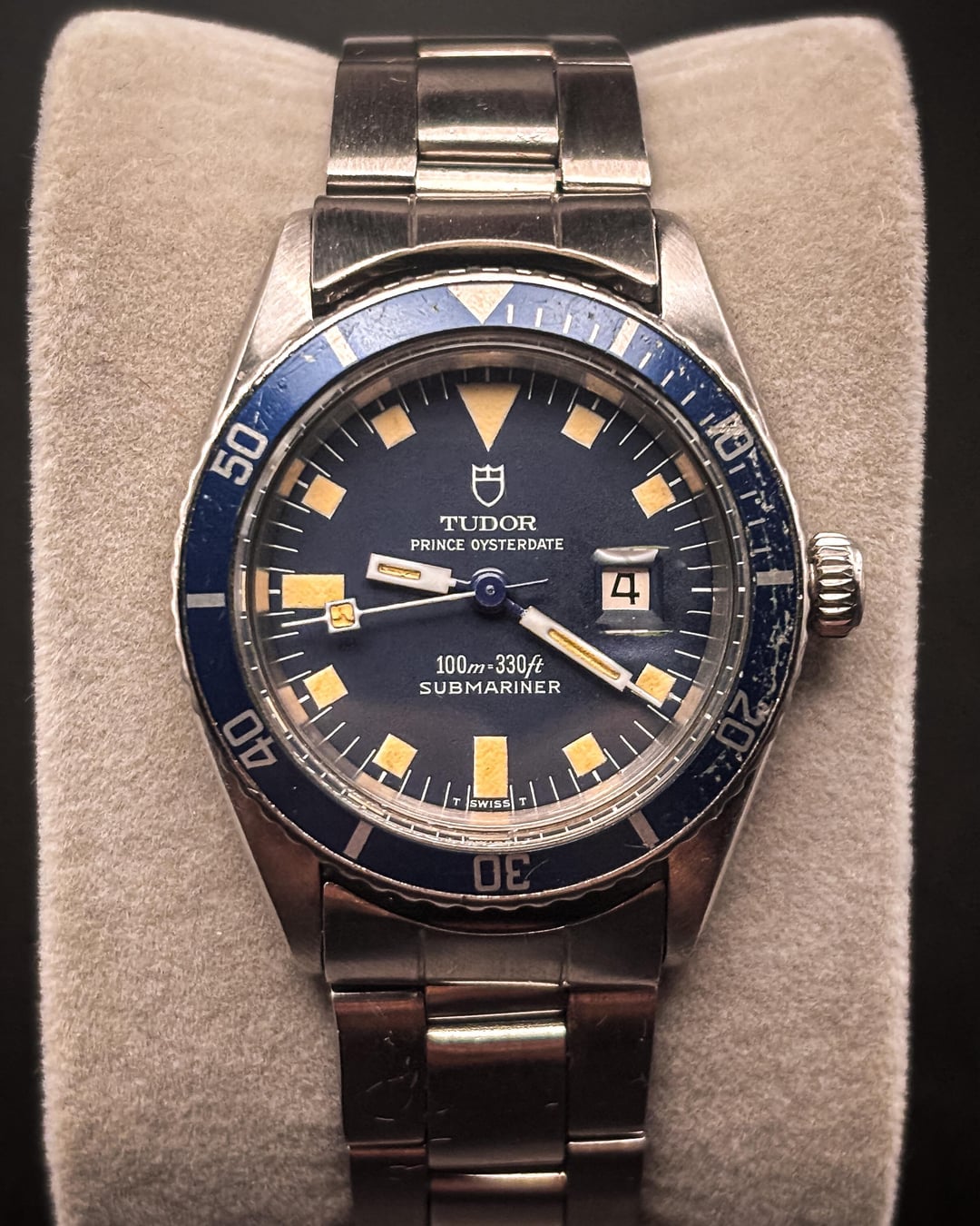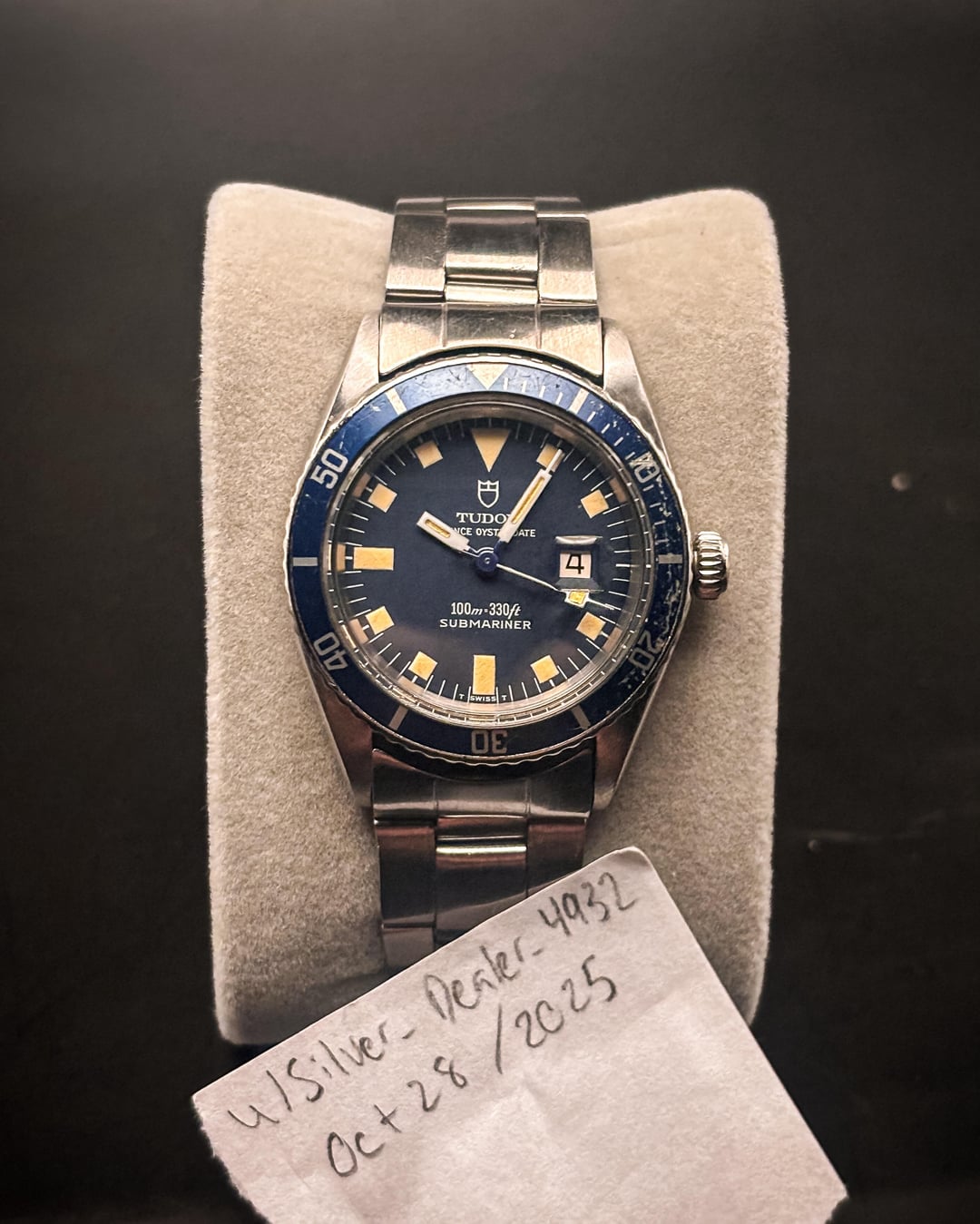 Condition – Great for the reference. The blue bezel has even fade and crisp rotation. The matte blue dial and hands show rich creamy lume with matching tone and no visible damage. Printing remains sharp and legible throughout. The original acrylic crystal was recently lightly polished, and the watch includes an extra replacement crystal. Case edges remain sharp with only faint hairlines from careful wear—no dents or major scratches. Bracelet and clasp show minimal handling wear consistent with light use. Movement winds smoothly and keeps accurate time following its recent Rolliworks service. ⸻ Includes — Rolliworks service papers dated 03/06/2024, a generic travel box, and an extra crystal. ⸻ Price – $2499 shipped via Zelle or bank wire. Add $15 for Apple Pay or $25 for Venmo. ⸻ Shipping – Ships same business day via FedEx 2day, fully insured! Shipping upgrade (overnight) available upon request. ⸻ Timestamp – Included in the attached photo set. ⸻ Overview – The Tudor Submariner Ref. 90910 “Blue Snowflake” is one of the most collectible Tudor divers of the late 1970s. Powered by the automatic ETA 2784 movement, it features the signature square-lume handset, matte blue dial, and blue aluminum bezel insert that inspired modern Tudor Black Bay designs. Serviced by Rolliworks in March 2024 and accompanied by an extra crystal, this example is clean, accurate, and ready to wear or collect.
