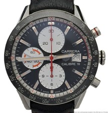 | TAG Heuer Carrera Calibre 16 Chronograph Steel Case Leather Strap w Box Card hessfineauctions (140940) |