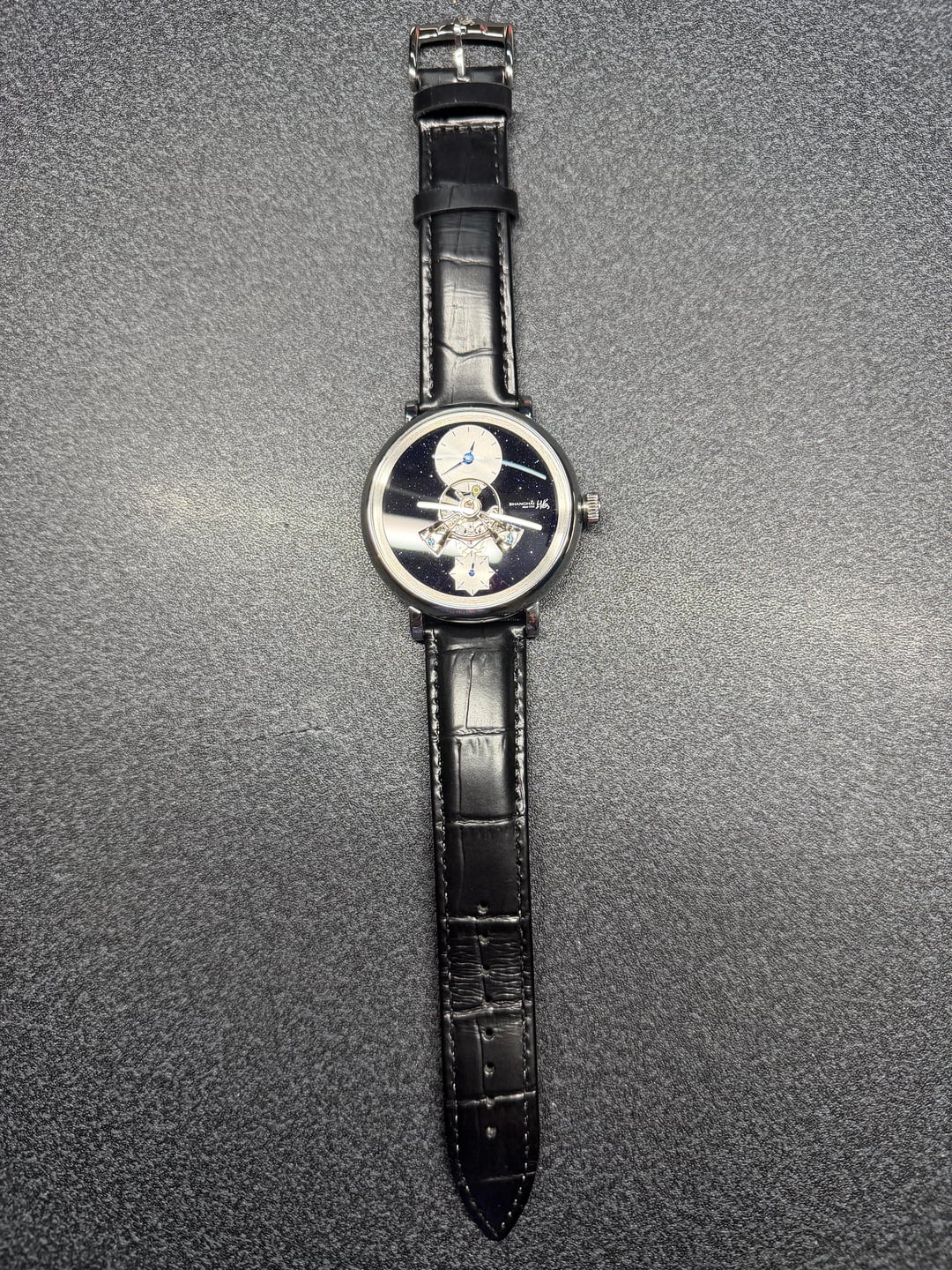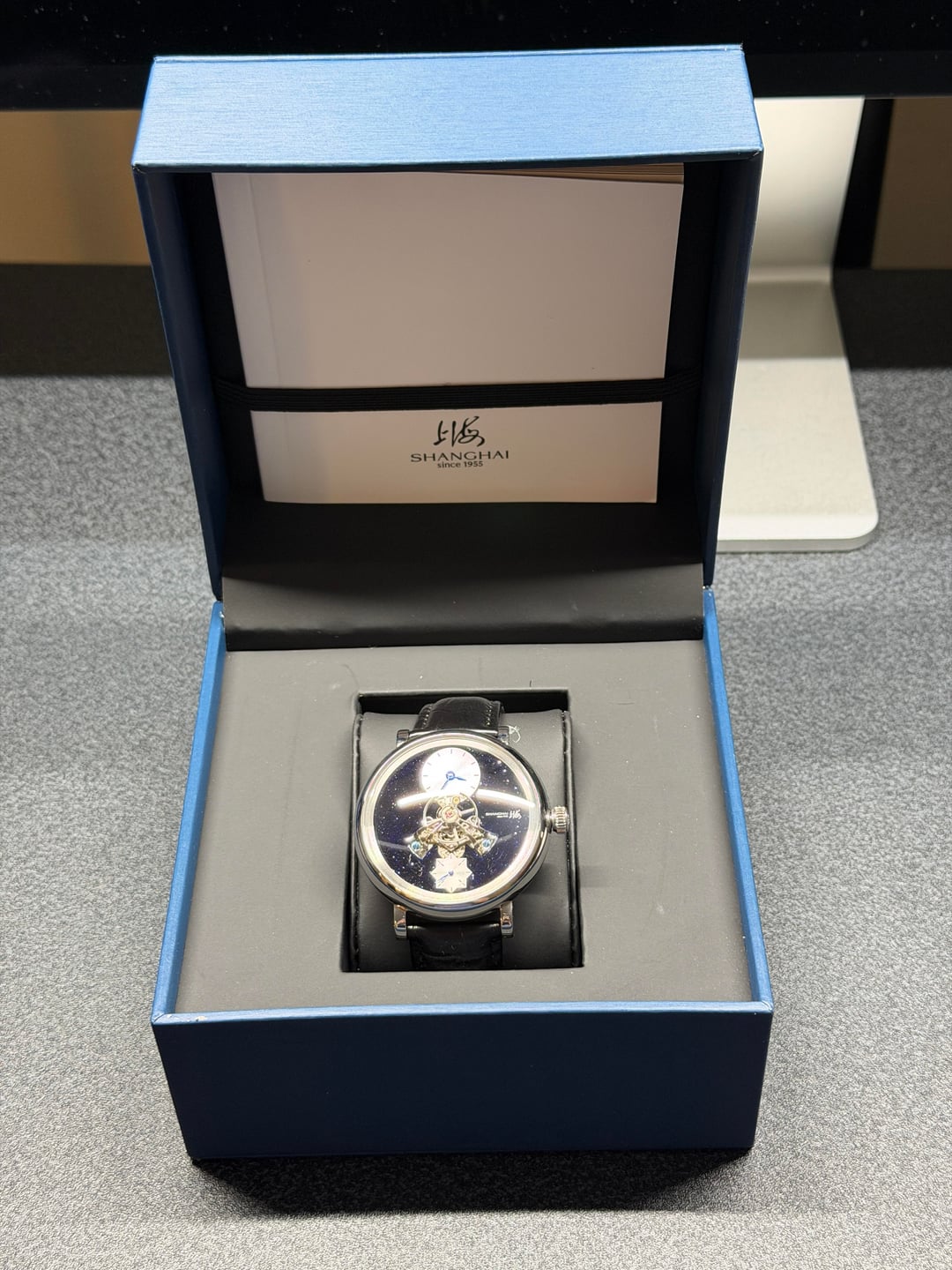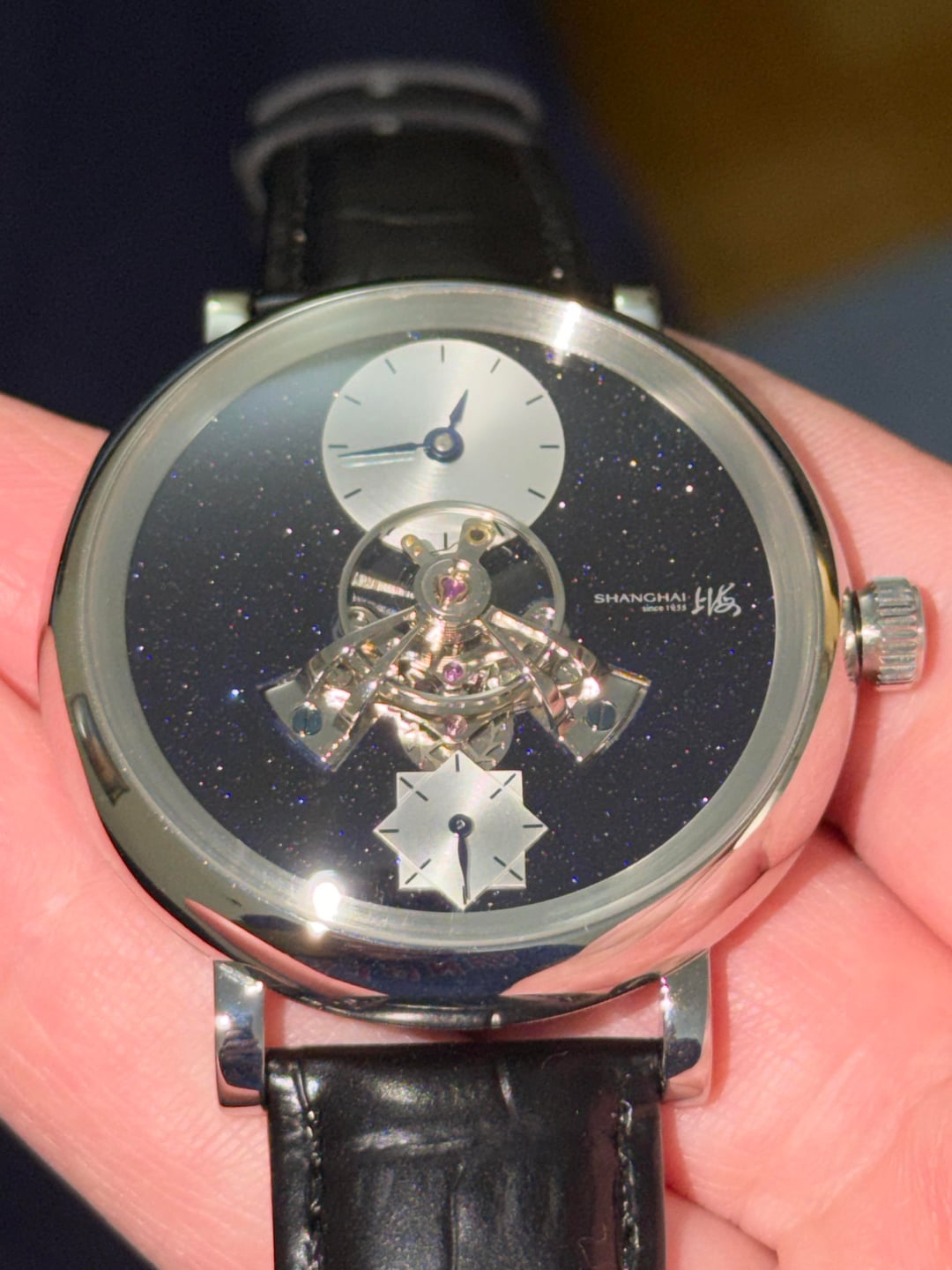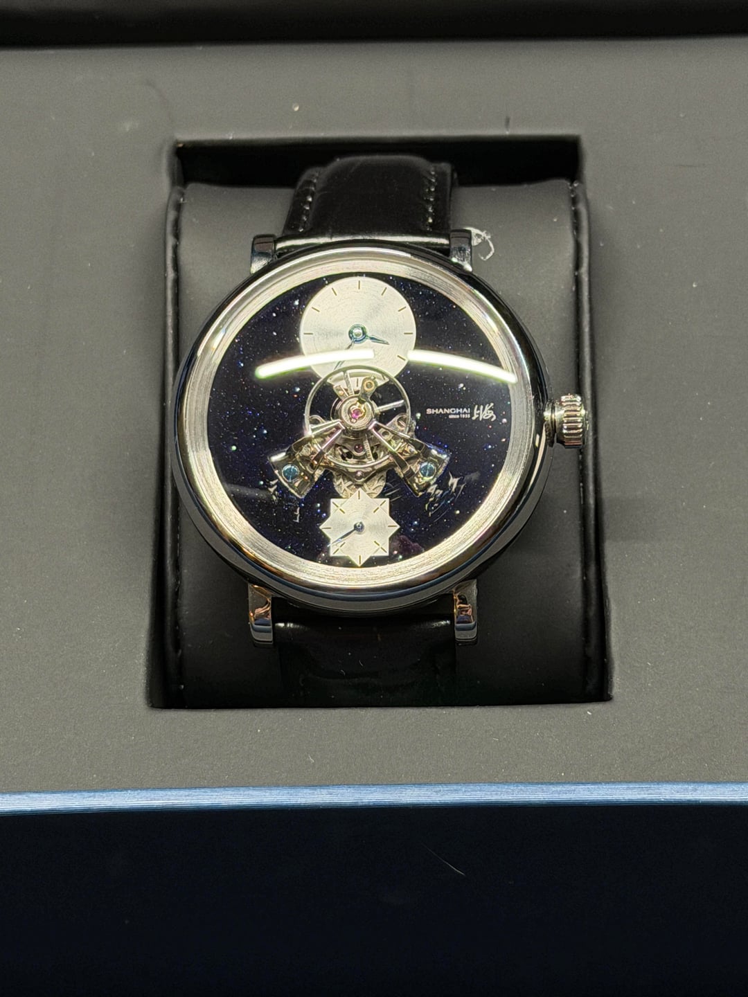 Hey folks Great condition, worn a couple times. Full kit. See pics for condition. $350 shipped conus PayPal F&F or Zelle. I have 55 positive transactions on watchexchange with good feedback so please read them. Also have an eBay store with hundreds of sales and hundreds of positive feedback so read them as well (offtherakcollectibles) Sale only, no trades. Ships from NYC so if you're in area can meet up locally. Please leave a comment here so I can view your transaction history and then message me if you're interested. Thank you! \--------------------- Shanghai F28 movement with protruded balance wheel at center, covered by a highly domed sapphire crystal. A 30-second small hand. **Chinese character:** 上海 - Shanghai. Position: At 3 o'clock on dial, crown, movement rotor, back side of strap and buckle. 上海表业有限公司出品 - Shanghai Watch Industry Company Limited Presents. Position: on case back. **MOVEMENT** Mechanical, self-winding. China Made. **Caliber**: Shanghai F28. **Functions**: Hour, minute, second (Hour and minute subidal at 12 o'clock. 30-second small hand at 6 o'clock.). No hacking (Seconds hand does NOT stop when crown is pulled out). **Jewels**: 34. **Frequency**: 21600 vph. **Power reserve**: Around 45 hours. **CASE** 316L stainless steel. Diameter: 43 mm. Thickness: 14.8 mm. Water resistance: 30 meters. Luminescence: No lume. **Dial**: Black. Blue goldstone. **Crystal**: Sapphire crystal. Double domed. Does NOT have anti-reflective coating. **Case back**: Fixed with screws. Transparent. **Crown**: Push-pull. Signed with the "上海" logo. **STRAP** Black. Leather. No quick release: Need tool to remove strap from case. Fit for case lug width: 20 mm. Fit for clasp lug width: 18 mm. **Clasp**: Pin buckle. Stainless steel clasp.