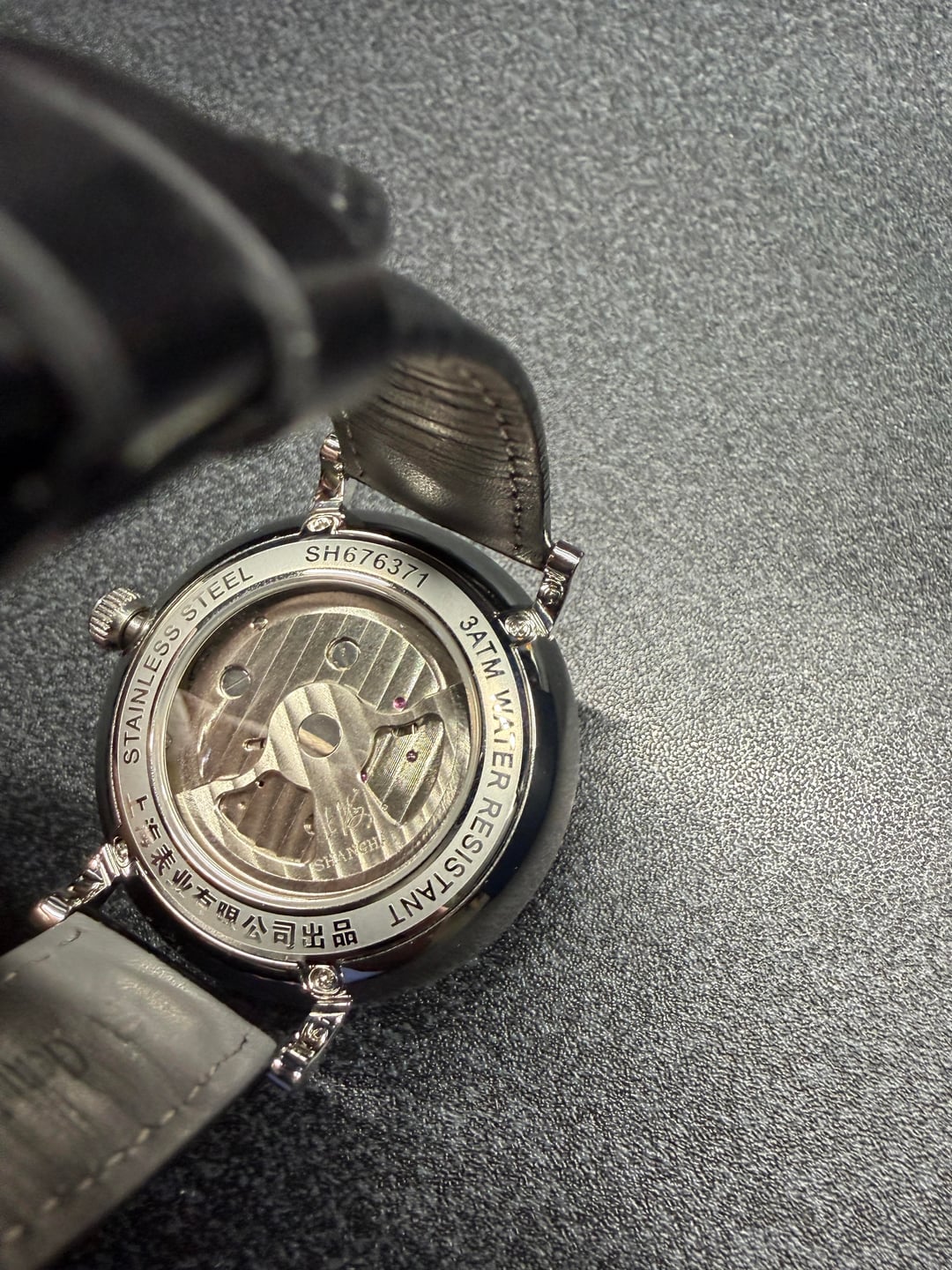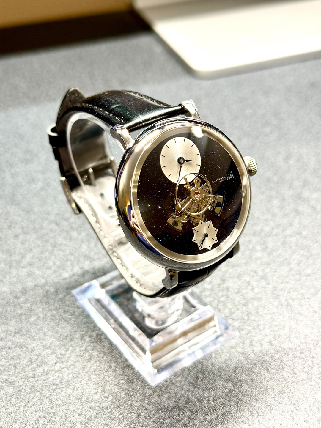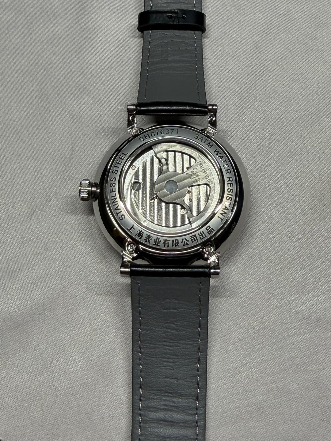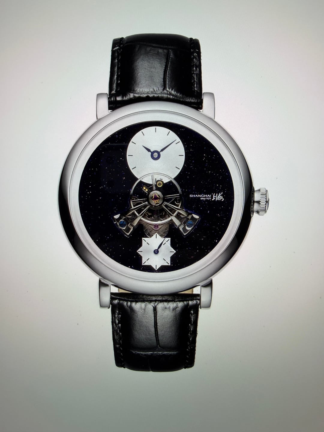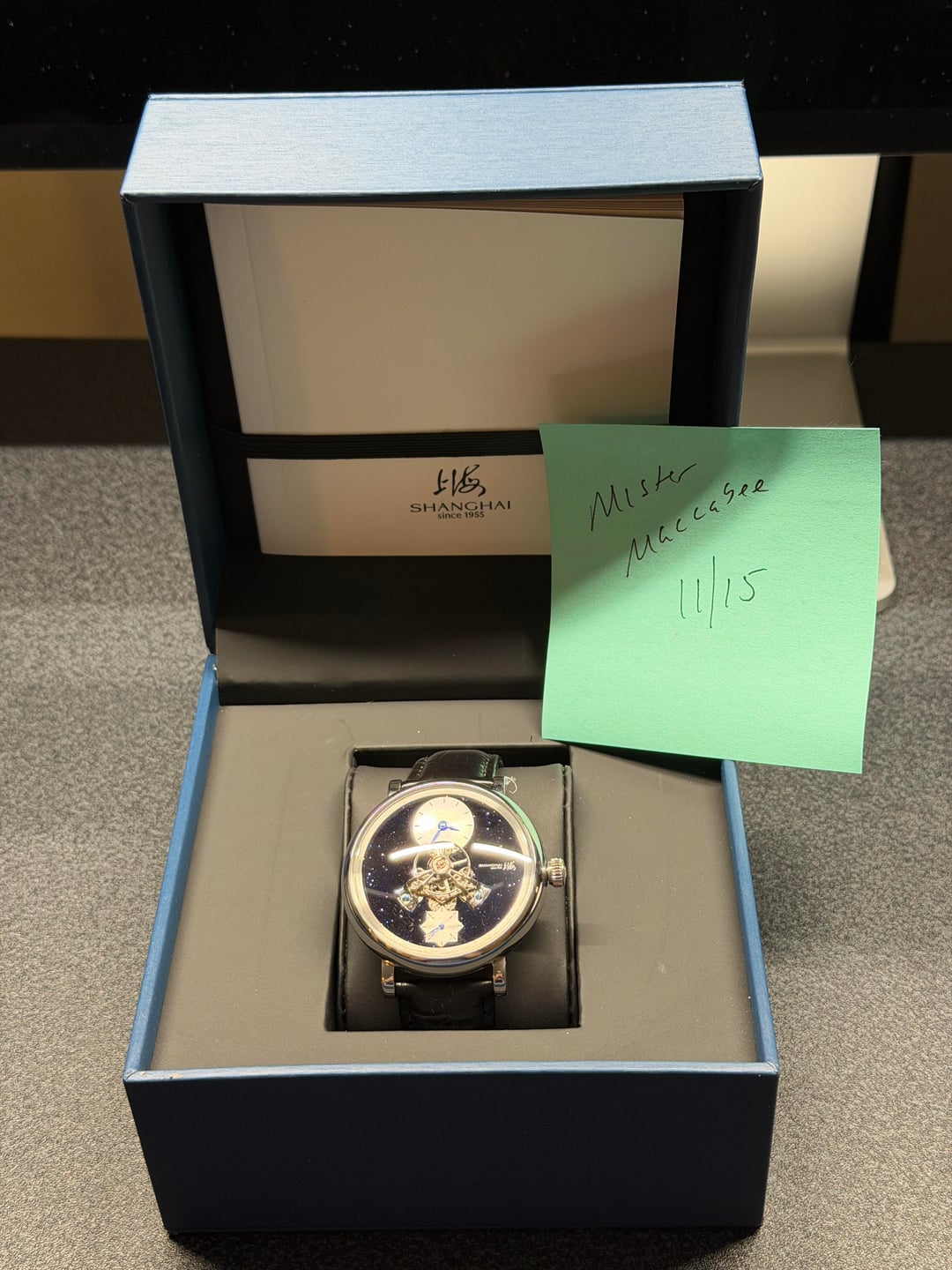 Hey folks Great condition, worn a couple times. Full kit. See pics for condition. $350 shipped conus PayPal F&F or Zelle. I have 55 positive transactions on watchexchange with good feedback so please read them. Also have an eBay store with hundreds of sales and hundreds of positive feedback so read them as well (offtherakcollectibles) Sale only, no trades. Ships from NYC so if you're in area can meet up locally. Please leave a comment here so I can view your transaction history and then message me if you're interested. Thank you! \--------------------- Shanghai F28 movement with protruded balance wheel at center, covered by a highly domed sapphire crystal. A 30-second small hand. **Chinese character:** 上海 - Shanghai. Position: At 3 o'clock on dial, crown, movement rotor, back side of strap and buckle. 上海表业有限公司出品 - Shanghai Watch Industry Company Limited Presents. Position: on case back. **MOVEMENT** Mechanical, self-winding. China Made. **Caliber**: Shanghai F28. **Functions**: Hour, minute, second (Hour and minute subidal at 12 o'clock. 30-second small hand at 6 o'clock.). No hacking (Seconds hand does NOT stop when crown is pulled out). **Jewels**: 34. **Frequency**: 21600 vph. **Power reserve**: Around 45 hours. **CASE** 316L stainless steel. Diameter: 43 mm. Thickness: 14.8 mm. Water resistance: 30 meters. Luminescence: No lume. **Dial**: Black. Blue goldstone. **Crystal**: Sapphire crystal. Double domed. Does NOT have anti-reflective coating. **Case back**: Fixed with screws. Transparent. **Crown**: Push-pull. Signed with the "上海" logo. **STRAP** Black. Leather. No quick release: Need tool to remove strap from case. Fit for case lug width: 20 mm. Fit for clasp lug width: 18 mm. **Clasp**: Pin buckle. Stainless steel clasp.