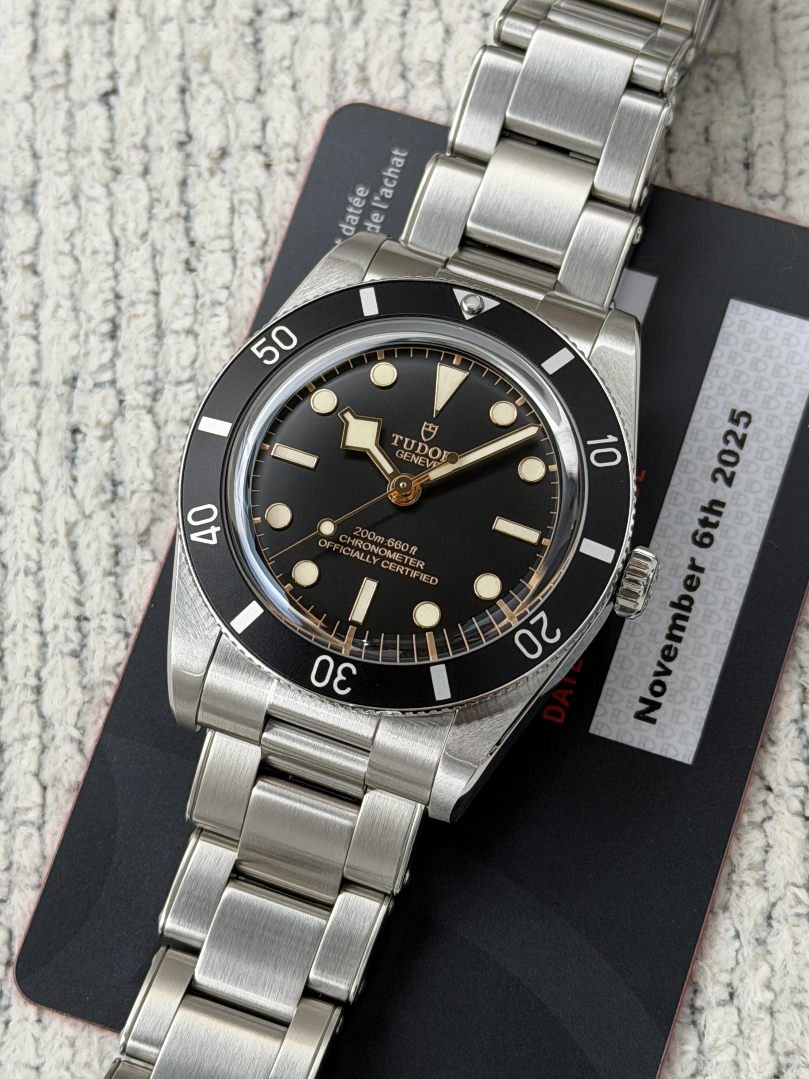 **Timestamp and Photos:** [https://imgur.com/a/black-bay-54-nov-2025-watchexchange-tpswJDV](https://imgur.com/a/black-bay-54-nov-2025-watchexchange-tpswJDV) Selling my **Tudor Black Bay 54** – inspired by Tudor’s first dive watch from 1954. Compact 37mm case, vintage styling, and perfect proportions for smaller wrists. Most importantly, it comes with the T-Fit micro-adjust clasp which is a gamechanger for daily wear. **Case size:** 37mm **Lug-to-lug:** 45.7mm **Thickness:** 11.1mm **Lug width:** 20mm **Condition:** Brand new. Never resized or even tried on. (I paid $4763.28 including tax. if you've ever tried to buy an R watch at retail, you know how this works). Comes with box, manuals, card dated November 2025 — warranty until 2030. Asking **$3375 shipped OBO** via Zelle or PayPal F&F. No trades. CONUS only. Feel free to DM with questions or offers. Thanks!