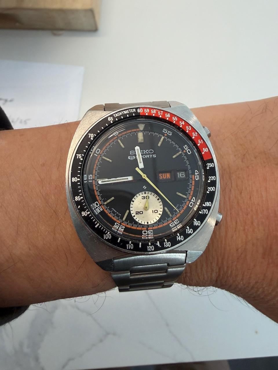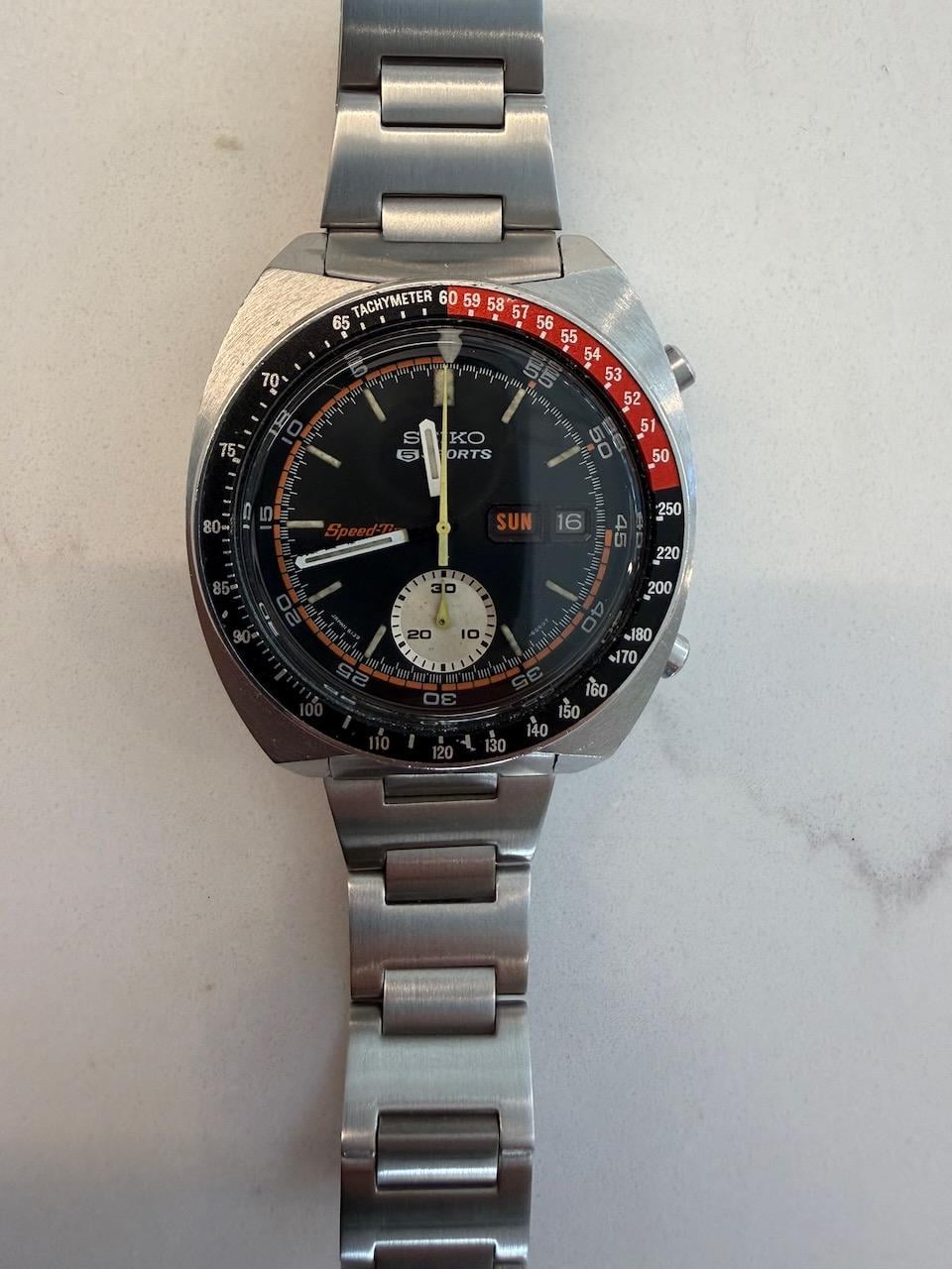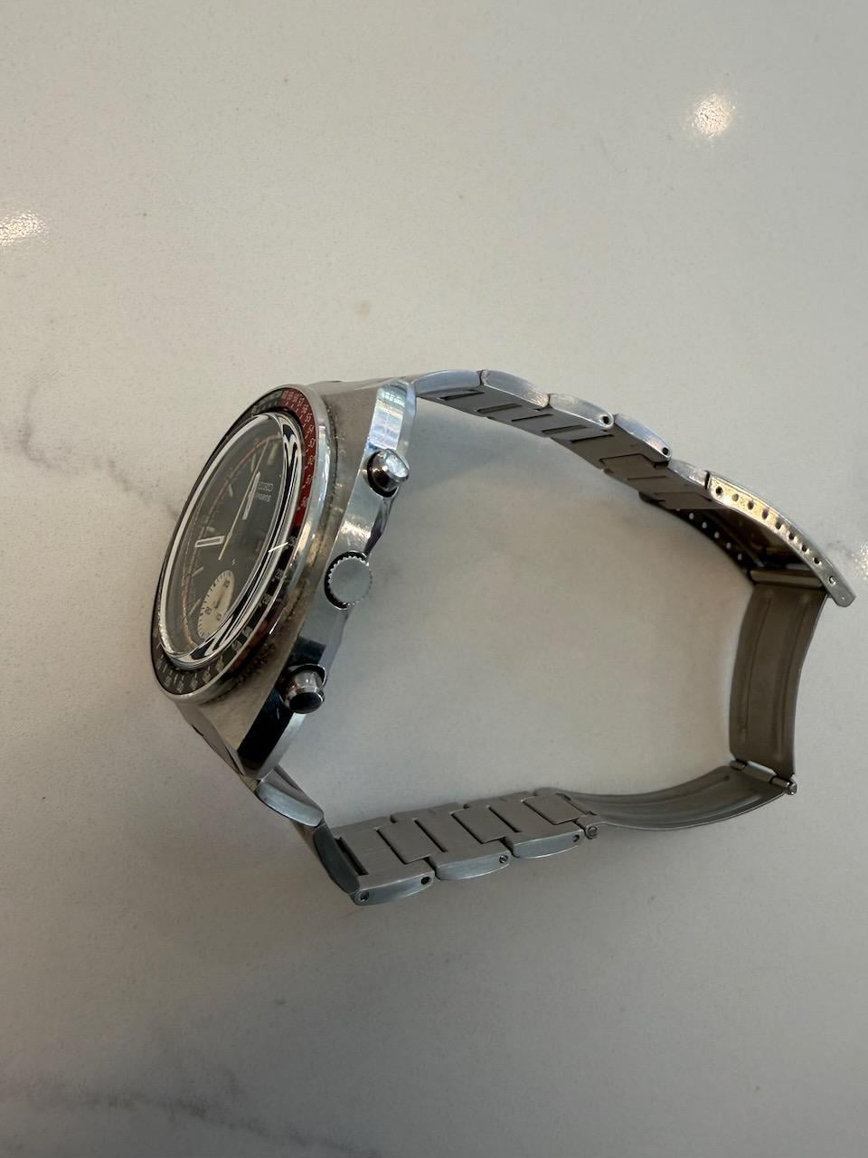 Up for sale is my Seiko Speedtimer reference 6139-6032, nicknamed “Speedtimer Coke”. Year of manufacture is 1972. Watch was recently serviced, with all new gaskets and crystal and keeps excellent time with all functions operating correctly. Watch is supplied on a period-correct steel bracelet from Uncle Seiko. I believe the rest of the watch is original, including original hands and dial and an unpolished case. Price is $750, including shipping to CONUS or face-to-face sale in northern NJ.