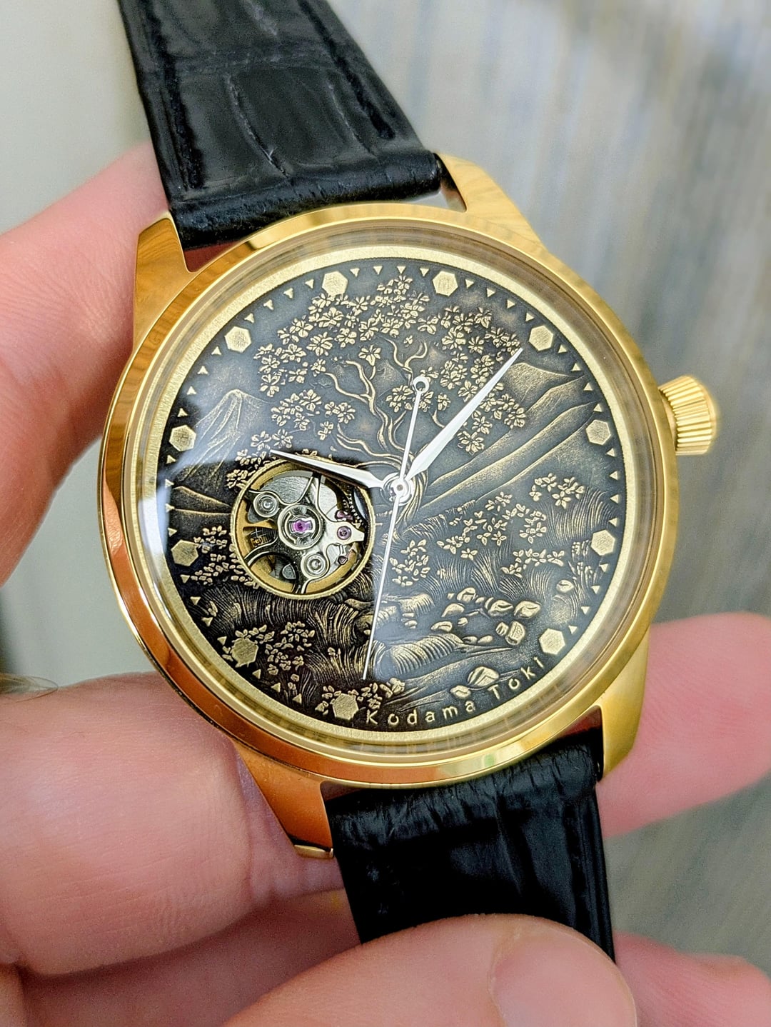 ***Kodama Toki (Spirit of Time.)*** Happy Sunday watch fam! For sale today we brand new CCW Model, "Kodama Toki" This dial was designed and made by me on my 50w fiber laser. It has 256 layers to create a 3d effect on the dial, cut out of a 0.5mm sheet of jeweler's bronze, and then hand finished with a Brass Black, polish, and wax. The dial is a beautiful 35mm size and I have housed it in a 39mm dress watch case. Powering the watch is the NH38 automatic movement, an absolute workhorse. The watch features an open caseback with a gold adorned rotor. I have a brown, tan, black, or green leather straps available, and this watch can come in a stainless steel, two tone, or yellow gold case. **I have both the open heart and non open heart versions available.** *All of my watches are completely customizable so if you would like to change anything about the watch please shoot me a message and would be happy to create something custom to fit your needs, or customize this dial further.* **Specs** Case Size: 39mm stainless steel dress case w/ open caseback and 20mm lugs. Dial: Custom designed, lasered, and hand finished 35mm dial featuring the "World Tree." 256 layers, for a video of this dial being made please see my IG linked below. Movement: NH38 Movement w/ 41+ hour power reserve, hacking, 24 Jewels, Open caseback with adorned rotor. 12.5mm Thickness Comes with a travel watch pouch for safekeeping :\] **Condition** Everything is brand new and ready to be shipped. Watch was custom-built by me to the highest quality. Message me if you have any questions. **Asking** $299 (leather strap) or $330 (milanese bracelet) shipped to CONUS. Will ship to other countries please contact me with location and I'll see what I can do. Payment via Venmo, Zelle, Cashapp, or Paypal+3%.