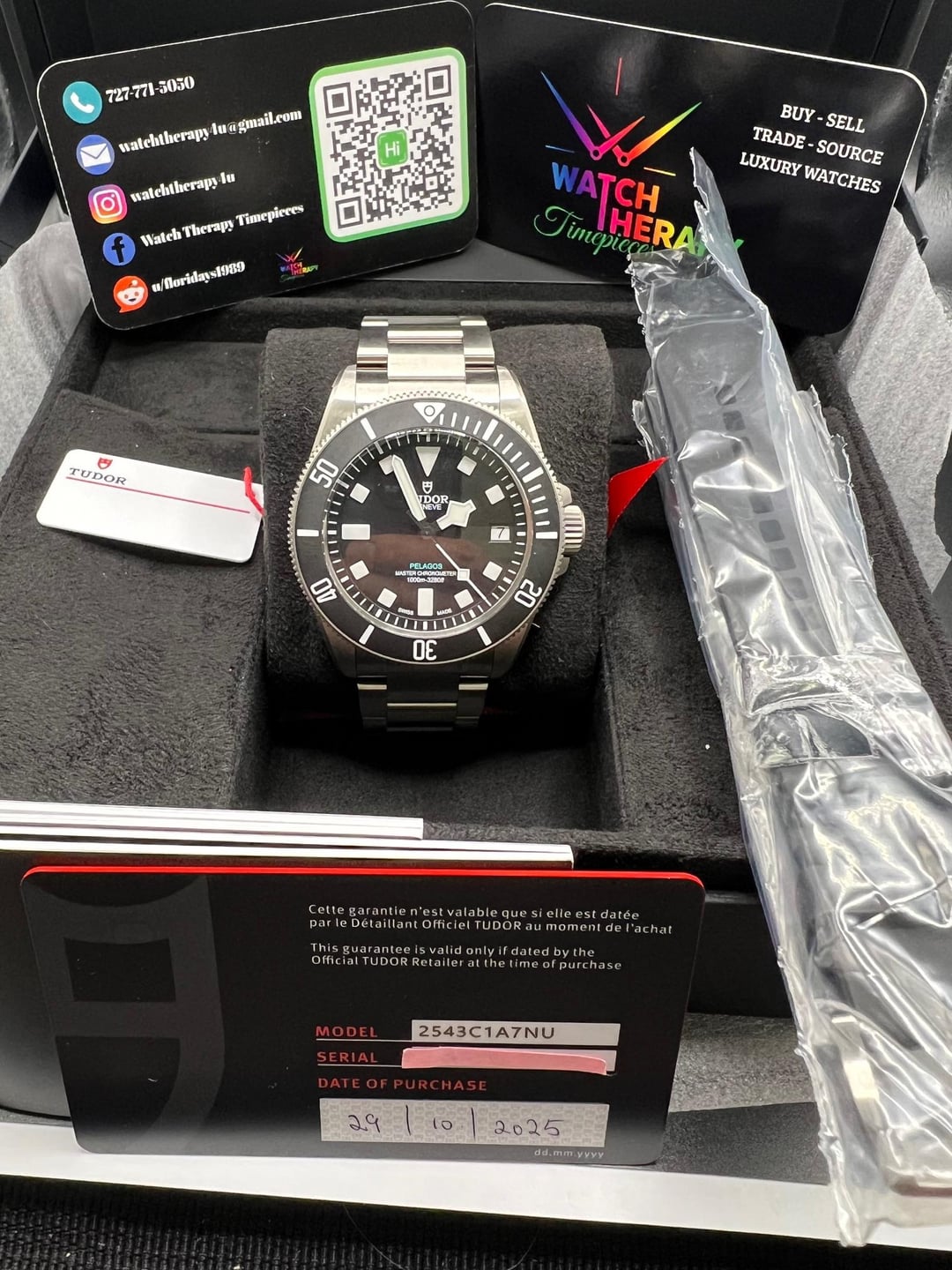**F/S: New 2025 Tudor Pelagos Ultra 10/25 Ref. 2543C1A7NU $5,199.00** **Shipping from Florida.** **Specs:** \* Beautiful matte black dial \* Self-winding \* Size 43mm Titanium case w/ unidirectional bezel \* TI bracelet w/T-Fit folding clasp with visual indicator \* 1000M Water Resistance \* 65-hour power reserve \* MT5612-U (COSC-METAS) movement **Includes**: Warranty card 10/25, double boxed, booklets, extra strap and full links. **Condition:** 10/10 Unworn, stickers **Price: $5,199.00 + Insured shipping to your local FedEx for pick-up in Con US**. I am also open to a face-to-face public transaction in or around the Tampa Florida Region, within reason. I have many strong and viable references within Reddit and from Buy/Sell/Trade Watch Facebook groups. Always willing to jump on a call or meeting link to show you the watch. Thank you and please reach out if you have any questions or concerns. Florida residents may be subject to sales tax w/o a valid resale cert. ***No Trades, TY*** **Location**: Tampa Florida **Payment:** Zelle or Wire Timestamp: [https://imgur.com/a/WHu25fg](https://imgur.com/a/WHu25fg) FB: Watch Therapy Timepieces IG: [@watchtherapy4u](https://www.reddit.com/u/watchtherapy4u/)
