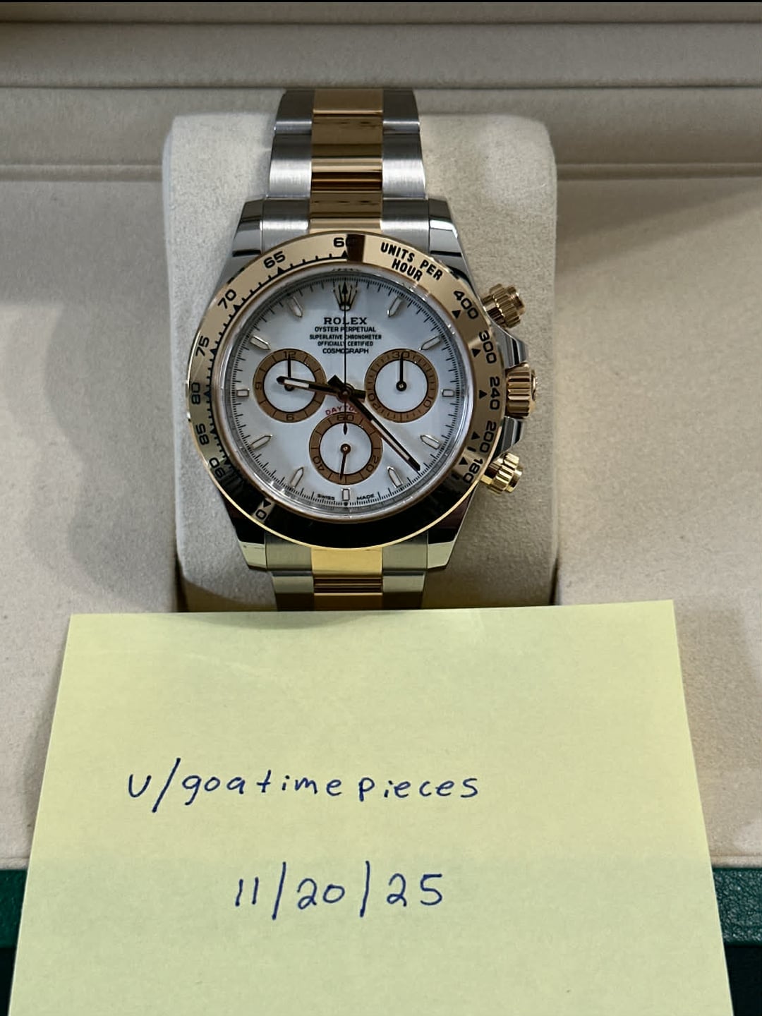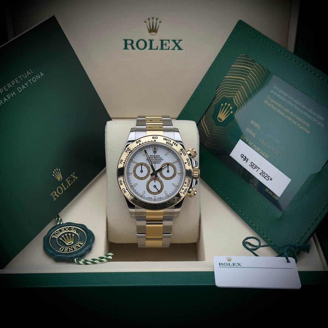 🔥NEW 2025 ROLEX DAYTONA🔥 Reference: 126503 Dial: Beautiful White Dial Case Size: 40Ⓜ️Ⓜ️ Material: Oystersteel/Yellow Gold $25,250 SHIPPED within the US Year: September 2025 Includes: Complete Set Condition: Brand New/Unworn **CROSSPOSTED** ------------------‐----------------------‐-----------------‐------------------ ***Please message me if you would like to see more pictures or if you would like me to show you live on a video call*** ***I have over 50 confirmed Reddit transactions. Buy with confidence!! https://www.instagram.com/goatimepieces?igsh=bTFkaWlscnR5aGJj