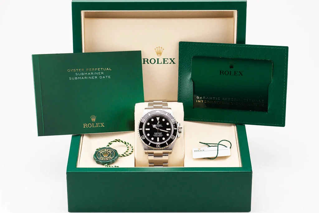Up for sale is a brand new Rolex Submariner No Date 41mm Ceramic, reference # 124060. It comes complete with all newly redesigned boxes, papers, booklets, hang tags, and Rolex Warranty Card dated October 2025.