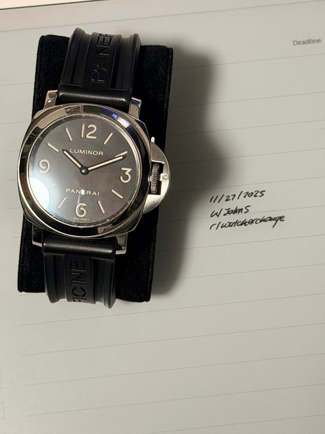 Hello all! Selling my Panerai Luminor Base PAM00112. Price: $3,599 + 🚢 OBO Comes with tools, double boxes, and warranty card (2016). The warranty data aligns with the watch on Panerai’s warranty site. The functions excellently and the timekeeping is strong. There is some wear from regular use to both the case and the strap. Please refer to the pictures. The sandwich dial is fantastic and the lume is exceptional. The PAM00112 is arguably the “purest” Panerai with the classic Luminor case, sandwich dial, two hands, and a transparent caseback. Shipping from ATL, GA. Accepting wire or PP F&F for established users. CONUS only. I’m always happy to get on the phone / FaceTime to show you the watch or discuss anything else. Plenty of references on this forum as well. No trades, please. Low ball bids will be ignored. Thanks!