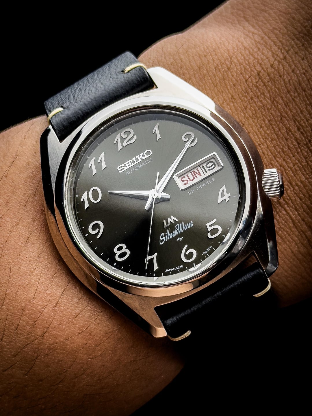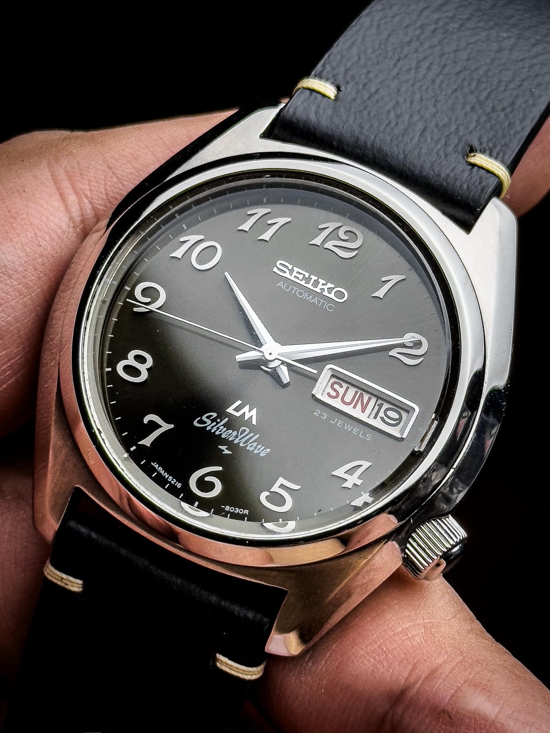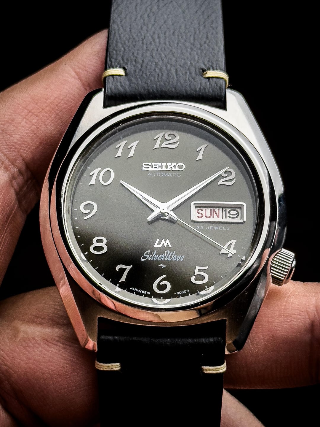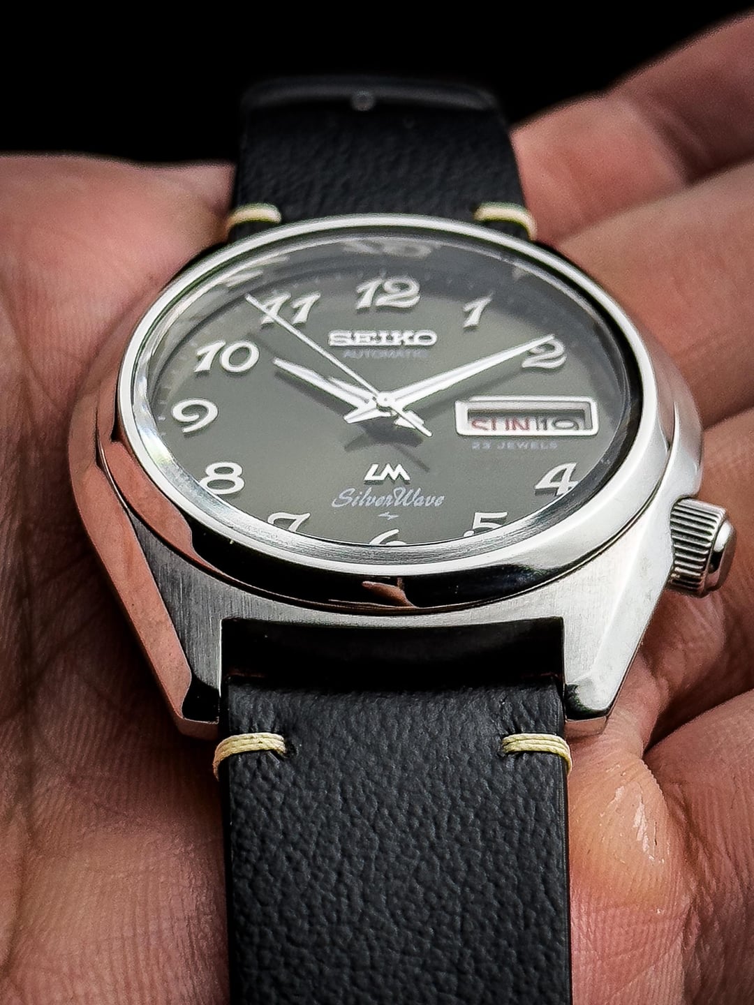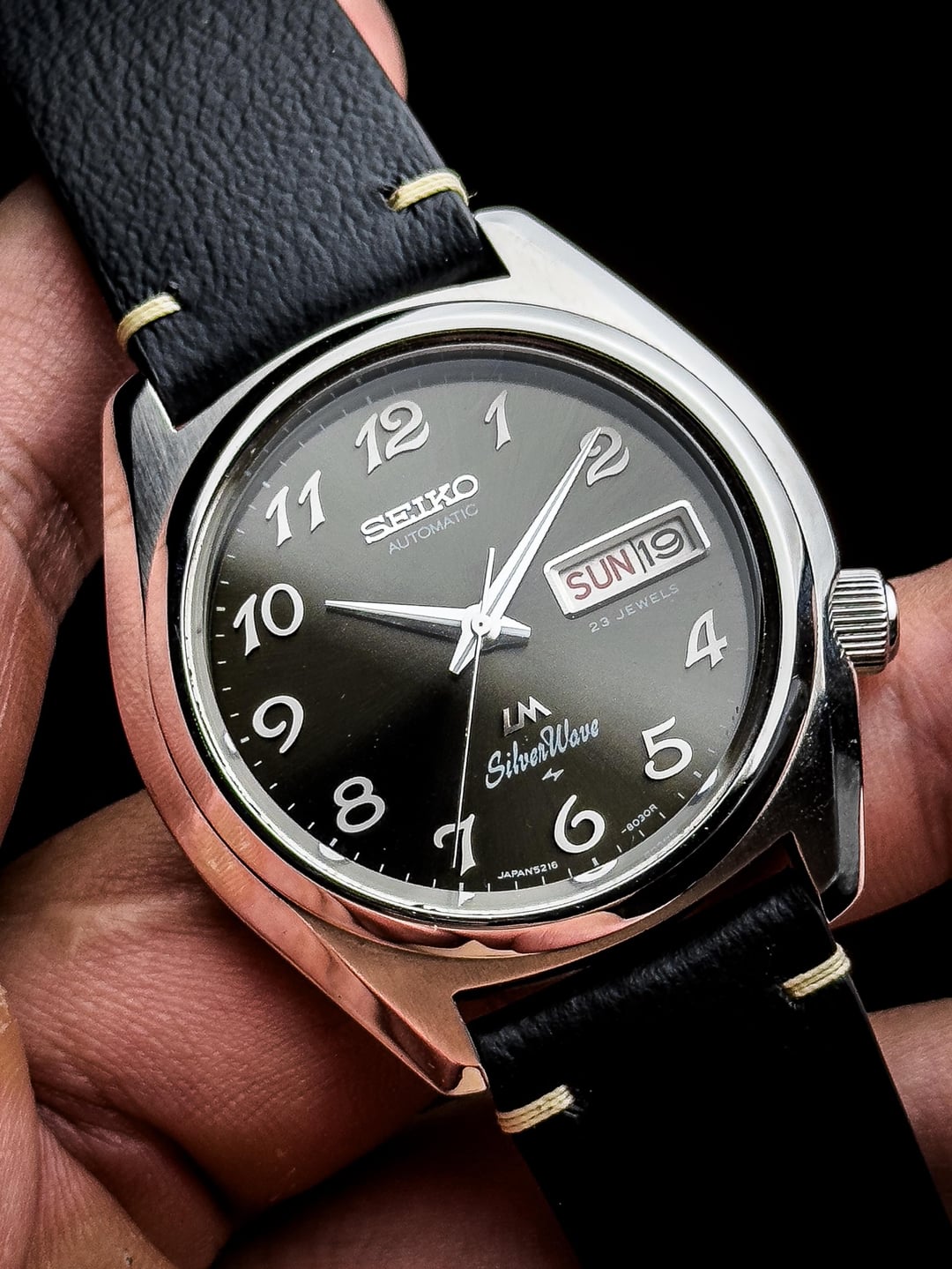 Up for sale is the 1976 Seiko LM Silverwave 5216-8030 Grey Sunburst Dial in excellent condition. Images: https://imgur.com/a/2MAStr8 Video: https://imgur.com/a/9wxaHMb Timestamp: https://imgur.com/a/zRNfyXf The Seiko LM (Lord Matic) Silverwave 5216-8030 is one of those quietly striking pieces from Seiko’s golden era — blending dressy sophistication with subtle sport cues. Produced in 1976, this model stands out with its sleek 38mm x 42mm stainless steel case, thin profile, and refined sunburst gray dial that shifts beautifully under light. At its heart beats the Caliber 5216A, one of Seiko’s higher-end automatic movements from the mid-70s. Running at 28,800 beats per hour, it features 23 jewels, hacking, manual winding, and a day-date complication, offering both precision and practicality. Despite its age, the movement remains one of Seiko’s most technically refined calibers of the period, developed under the LM Special and King Seiko lineage. The watch is topped with a Seiko Hardlex crystal and retains its screw-down case back engraved with the Silverwave emblem — a nice nod to Seiko’s water-oriented designs of the time. The 19mm lug width gives you plenty of strap versatility, while the slim case (~10.5mm thick) allows it to sit effortlessly under a cuff. This watch is in excellent condition, showing minor hairline scratches from careful wear. Crystal is nice and clean and dial is clean and free of any marks or scratches. Watch comes fitted on the custom leather bracelets. The watch has been serviced recently so it keeps great time. Although, it doesn’t come with original box, a standard watch box will be provided upon receive. Price: $575 + $60 flat shipping (via UPS/DHL - tariffs/duty fee covered). Payment via PayPal F&F or G&S (+4.6% fee paid by buyer). Not accepting trades. Feel free to message me with any questions or if you're interested. Have a great day! Check out my other watches on Instagram: @jasonswatchcorner